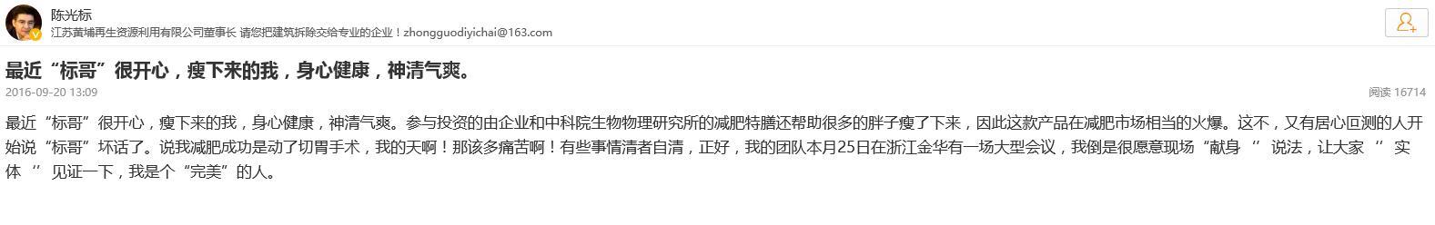 20日中午12点30分,陈光标在接受封面新闻(thecover.cn)记者电话采访时独家回应称,“切胃减肥”之说,完全是造谣。“我将在北京找一个游泳池,身穿泳装,通过高清视频晒我的身体,证明身体没有任何疤痕。”