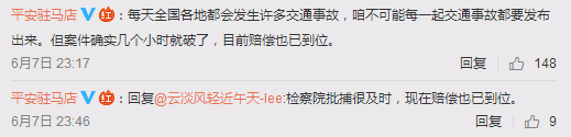 面对网友的“路人太冷漠”质疑声,6月7日,驻马店警方通过官微与网友进行了互动。警方称,涉案司机已被逮捕,赔偿也已到位。针对无人施救问题,驻马店警方官微回复:“当时有十几个人拨打110120电话,但是无人敢轻易挪动伤者。”