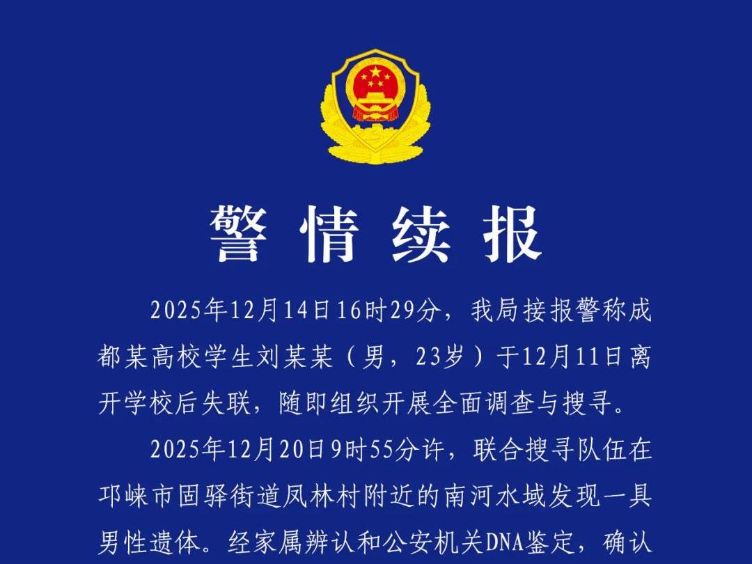 成都23岁大学生失联9天后遗体被发现,警方:排除刑案