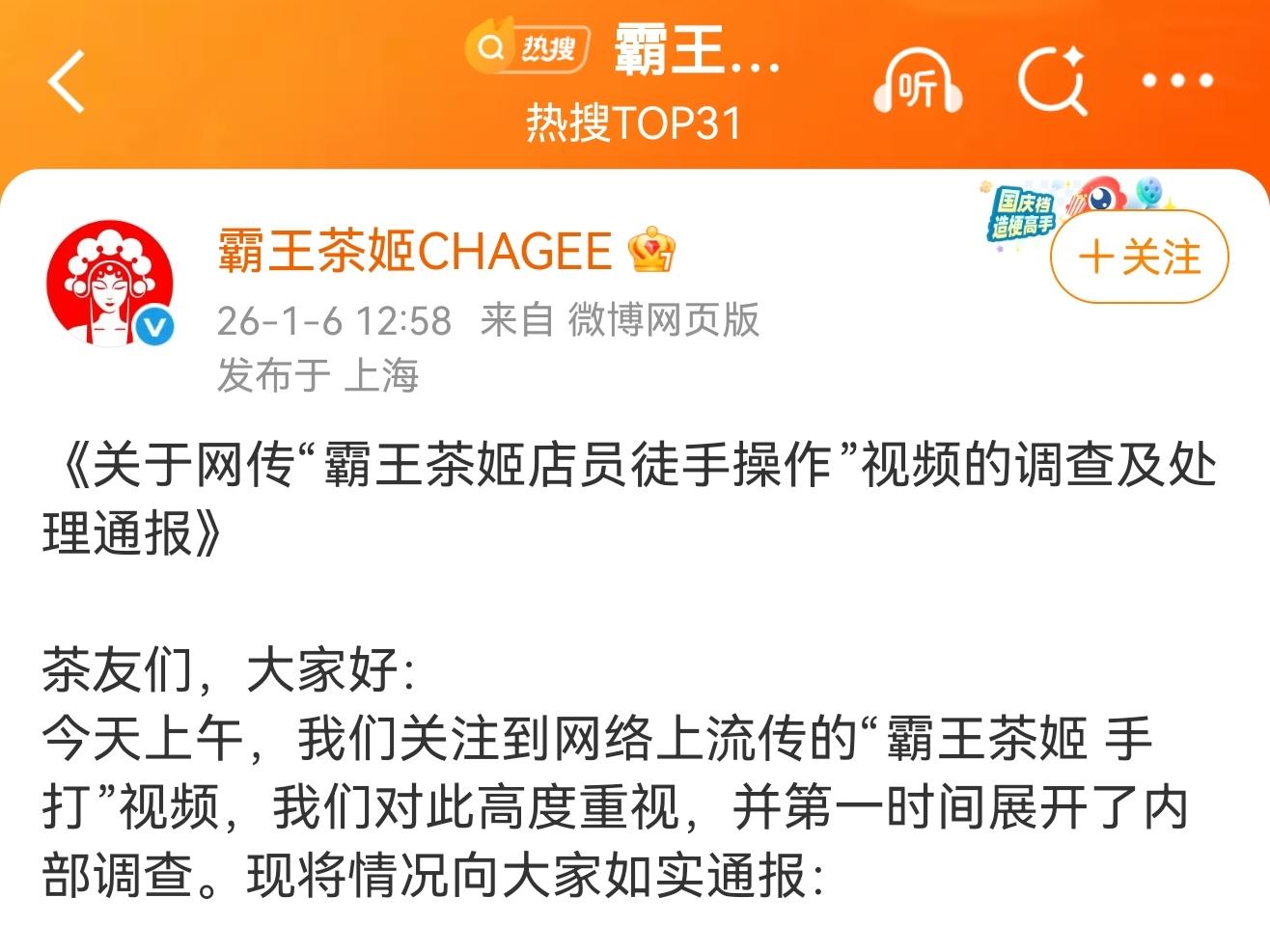 霸王茶姬发文回应店员“手打奶茶”:系模仿摆拍,未对外销售,涉事门店无限期停业整顿