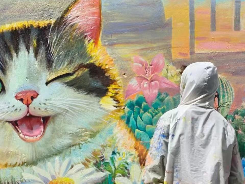 绵阳猫咪墙绘爆红 有人骑行50公里打卡 画师阿伟:梦想是巡游全国绘画