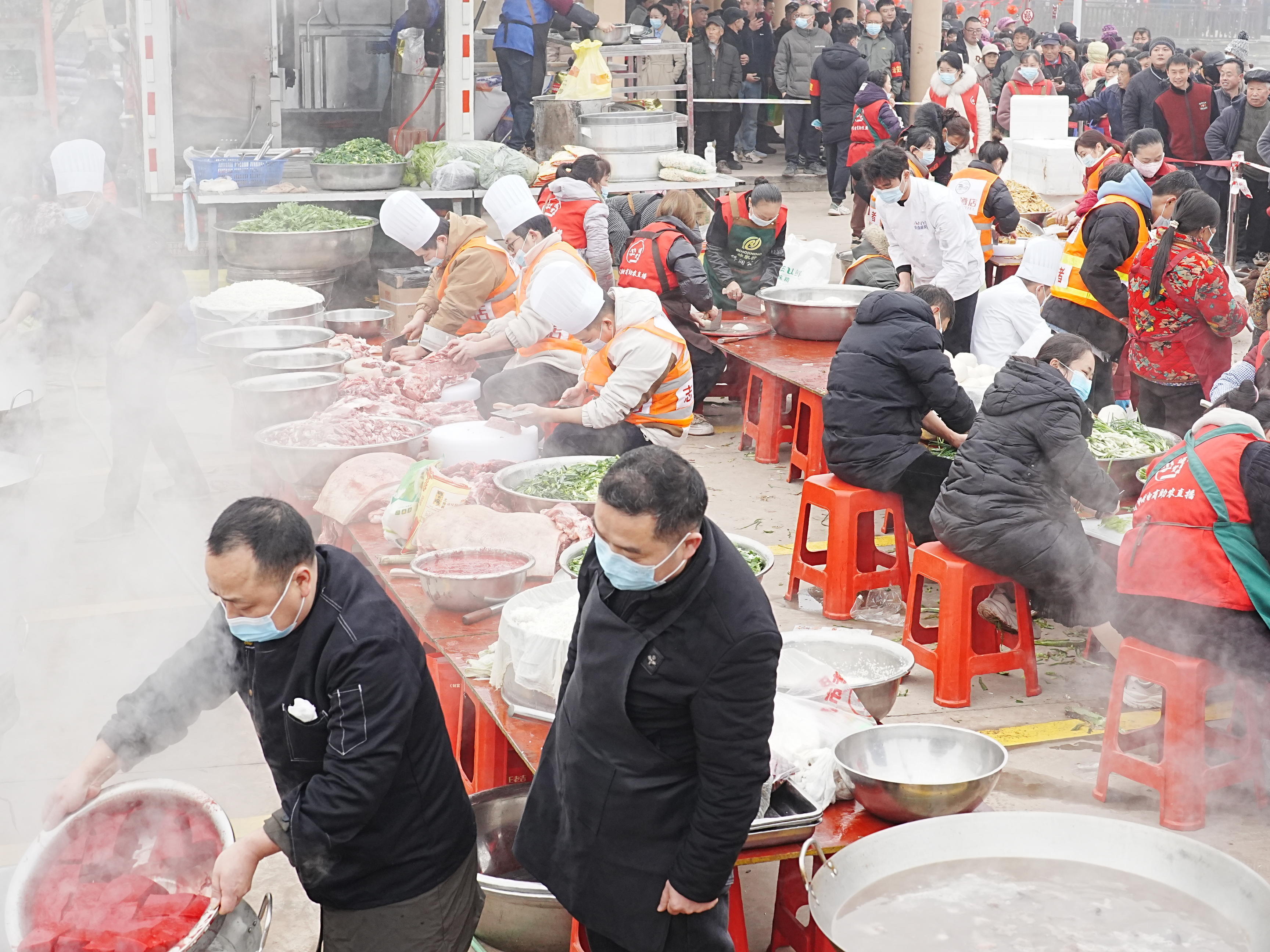 四川安岳万人刨猪汤今日开吃 现场热闹得像在过年