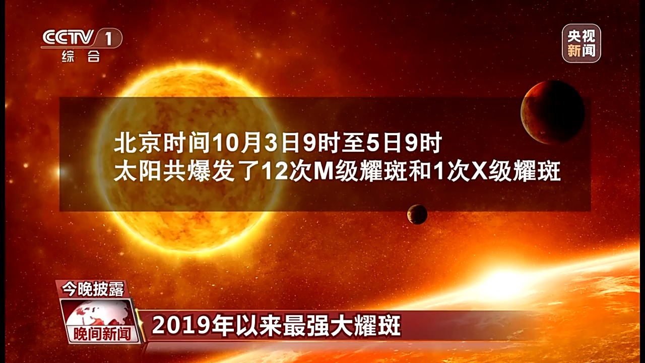 根据监测,北京时间10月3日9时至5日9时,太阳共爆发了12次M级耀斑和1次X级耀斑。10月3日20时18分,太阳活动区13842爆发峰值强度为X9.0级的大耀斑,这是自2019年到现在,第25太阳活动周里,太阳爆发的最强耀斑。