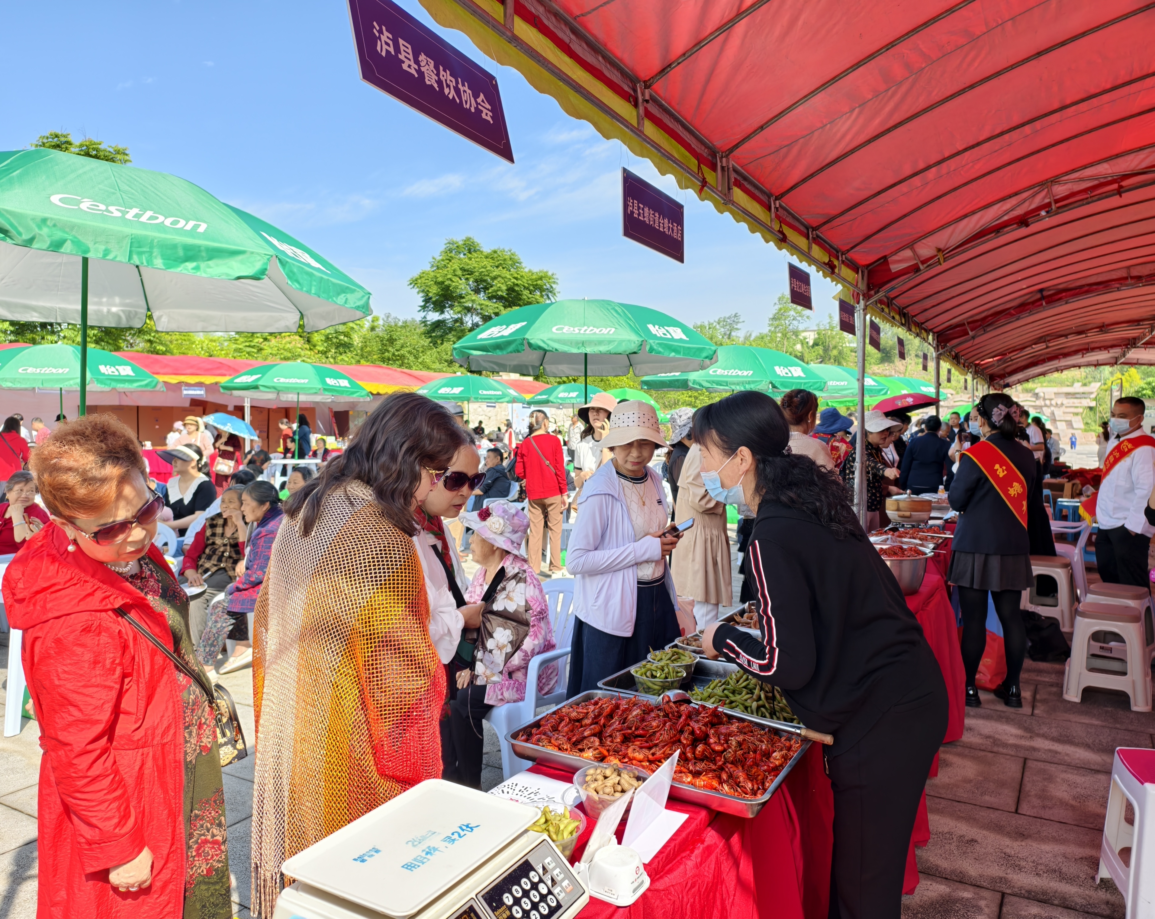 在当天的开幕式活动现场,来自泸县的餐饮商家开展了消费满减(赠)活动,并设置了展位,展示展销泸县特色产品,如柚子茶、小龙虾、鸵肉等。此外,还有制作扎染、漆扇等非遗代表性项目以及沉浸式着汉服拍照打卡体验。