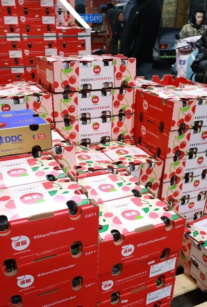 批发市场里成箱的车厘子待售