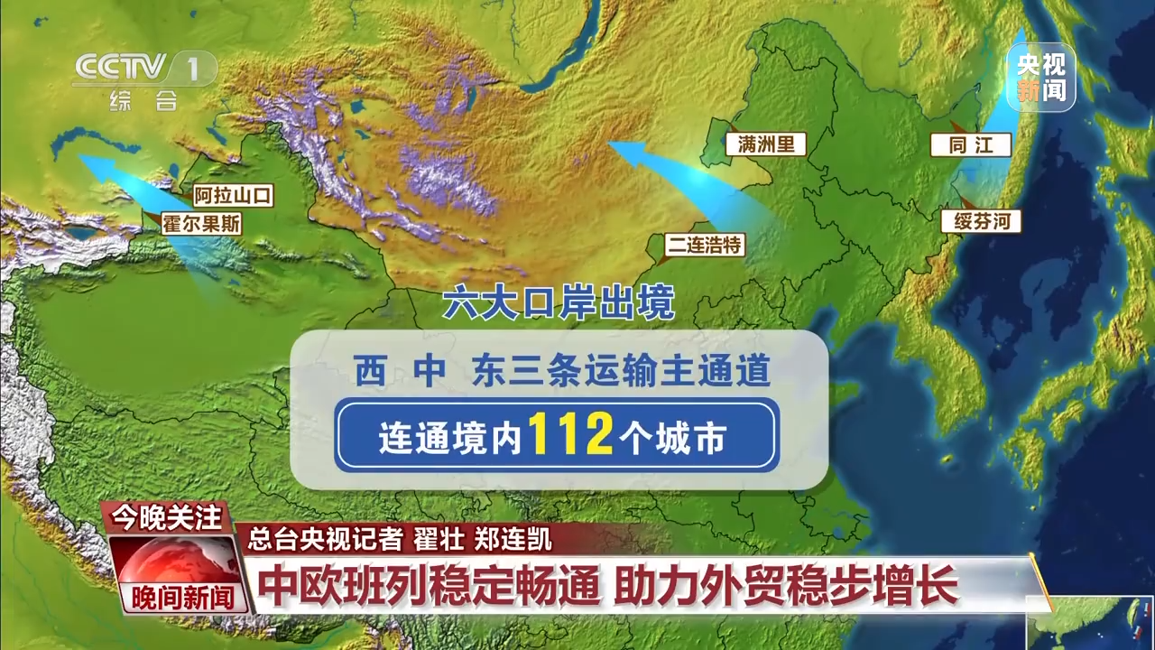 今年七月,随着中欧班列同江口岸投入运营,在境内,已形成经阿拉山口、霍尔果斯、二连浩特、满洲里、绥芬河、同江六大口岸出境的西、中、东三条运输主通道,连通境内112个城市;在境外,初步形成通达欧洲25个国家200多个城市,覆盖亚欧大陆全境的运输服务网络。