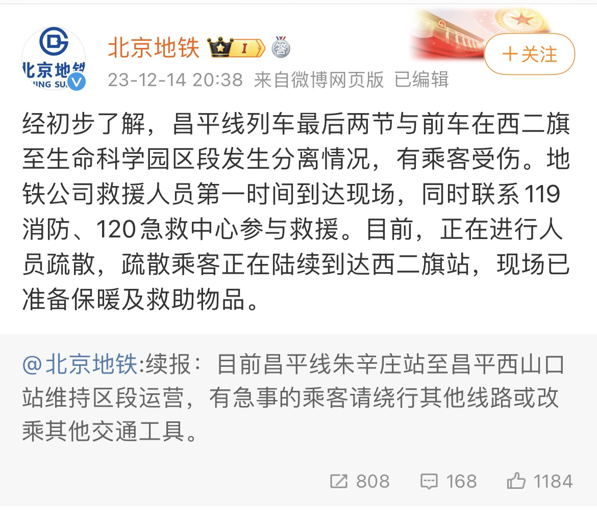 当晚20时38分,北京地铁官方微博发布消息称,经初步了解,昌平线列车最后两节与前车在西二旗至生命科学园区段发生分离情况,有乘客受伤。地铁公司救援人员第一时间到达现场,同时联系119消防、120急救中心参与救援。目前,正在进行人员疏散,疏散乘客正陆续到达西二旗站,现场已准备保暖及救助物品。