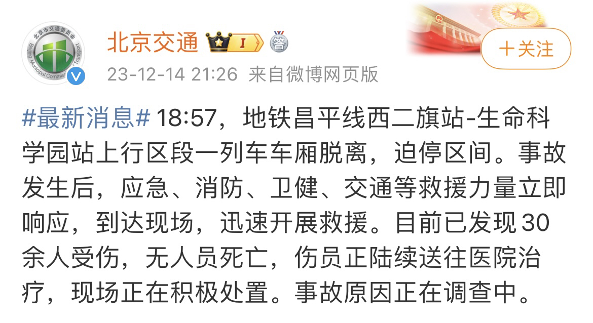 晚21时26分,北京交通官方微博发布消息称,目前已发现30余人受伤,无人员死亡,伤员正陆续送往医院治疗,现场正在积极处置。事故原因正在调查中。