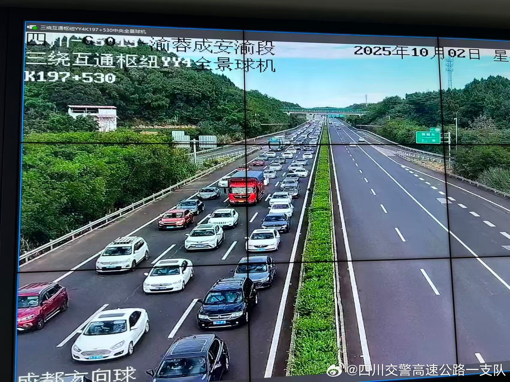 10月2日,国庆假期第二日,不少人正在路上。记者从四川高速公安一分局获悉,截至上午9时55分,成都周边高速部分路段车流量大出现排行。