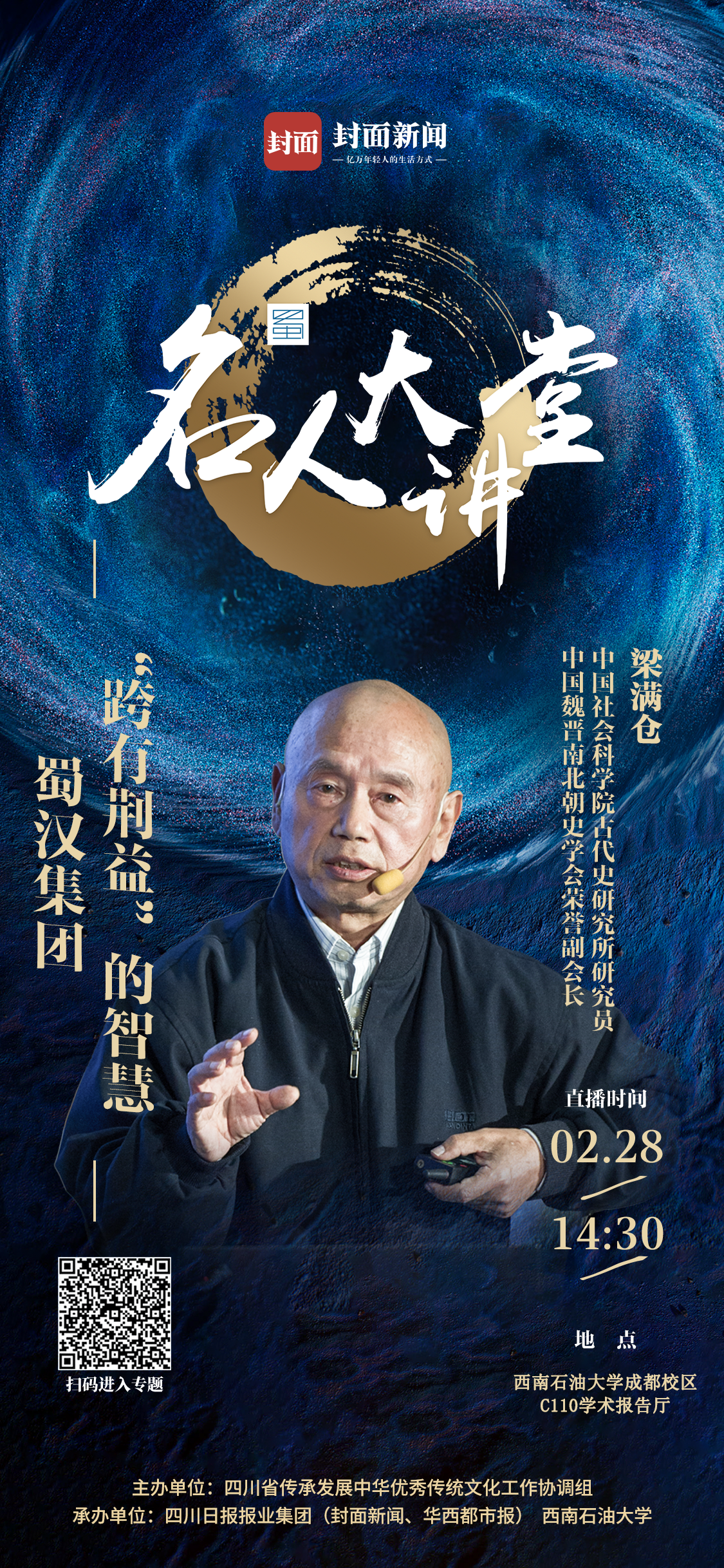 2月28日下午,名人大讲堂“三国文化季”的第三场讲座将在西南石油大学开启,中国社会科学院古代史研究所研究员,中国魏晋南北朝史学会荣誉副会长,四川省诸葛亮研究中心首席专家兼学术委员会主任梁满仓将以《蜀汉集团“跨有荆益”的智慧》为题,为线上线下观众深入解析三国蜀汉的战略设计,以及智慧略论。