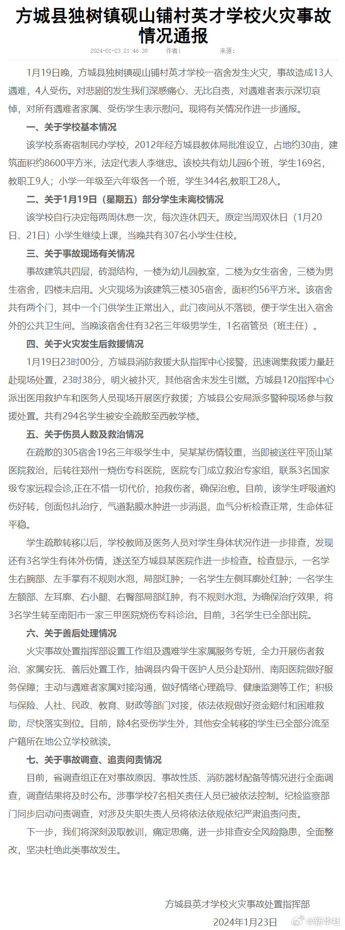 【河南方城学校火灾事故7人已被依法控制】记者从河南方城县英才学校火灾事故处置指挥部获悉:目前,省调查组正在对事故原因、事故性质、消防器材配备等情况进行全面调查,调查结果将及时公布。涉事学校7名相关责任人员已被依法控制。纪检监察部门同步启动问责调查,对涉及失职失责人员将依法依规依纪严肃追责问责。(记者:韩朝阳)