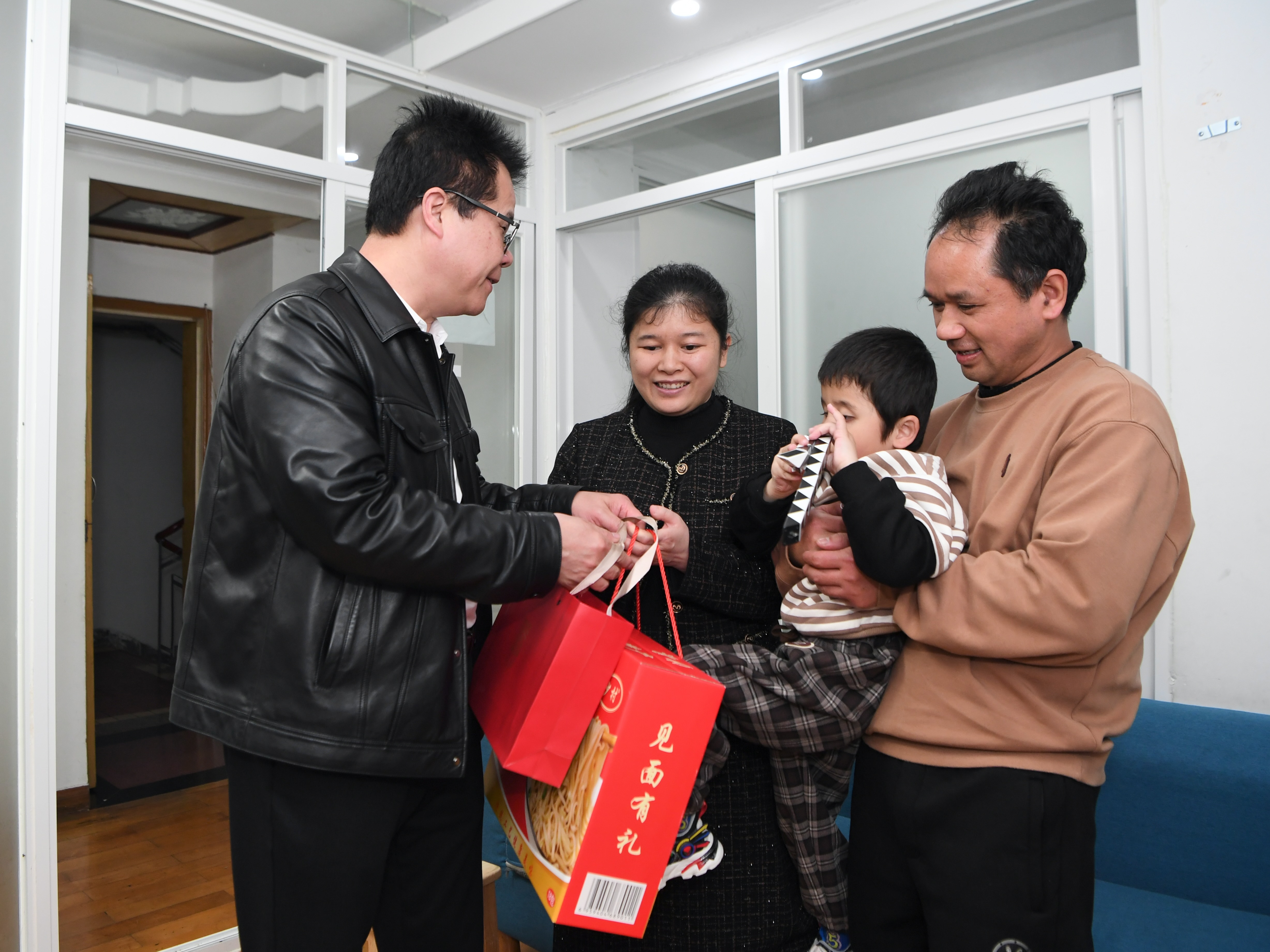 王永澄(左一)在福州市鼓楼区红墙巷小区为盲人家庭送来新春慰问(2月18日摄)。