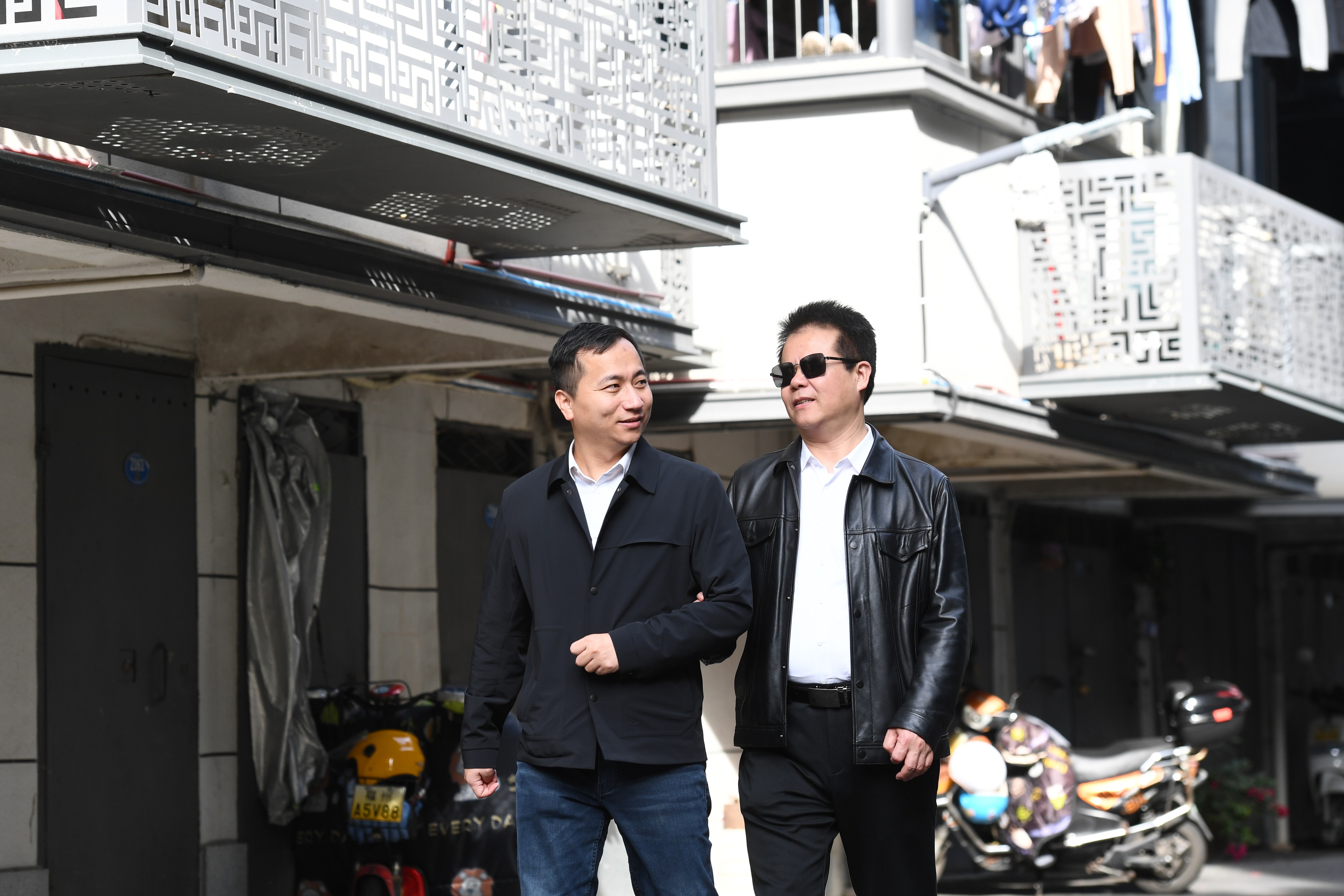 王永澄(右)在志愿者的协助下前往福州市鼓楼区红墙巷小区调研盲人家庭子女入学及保障房入住情况(2月18日摄)。