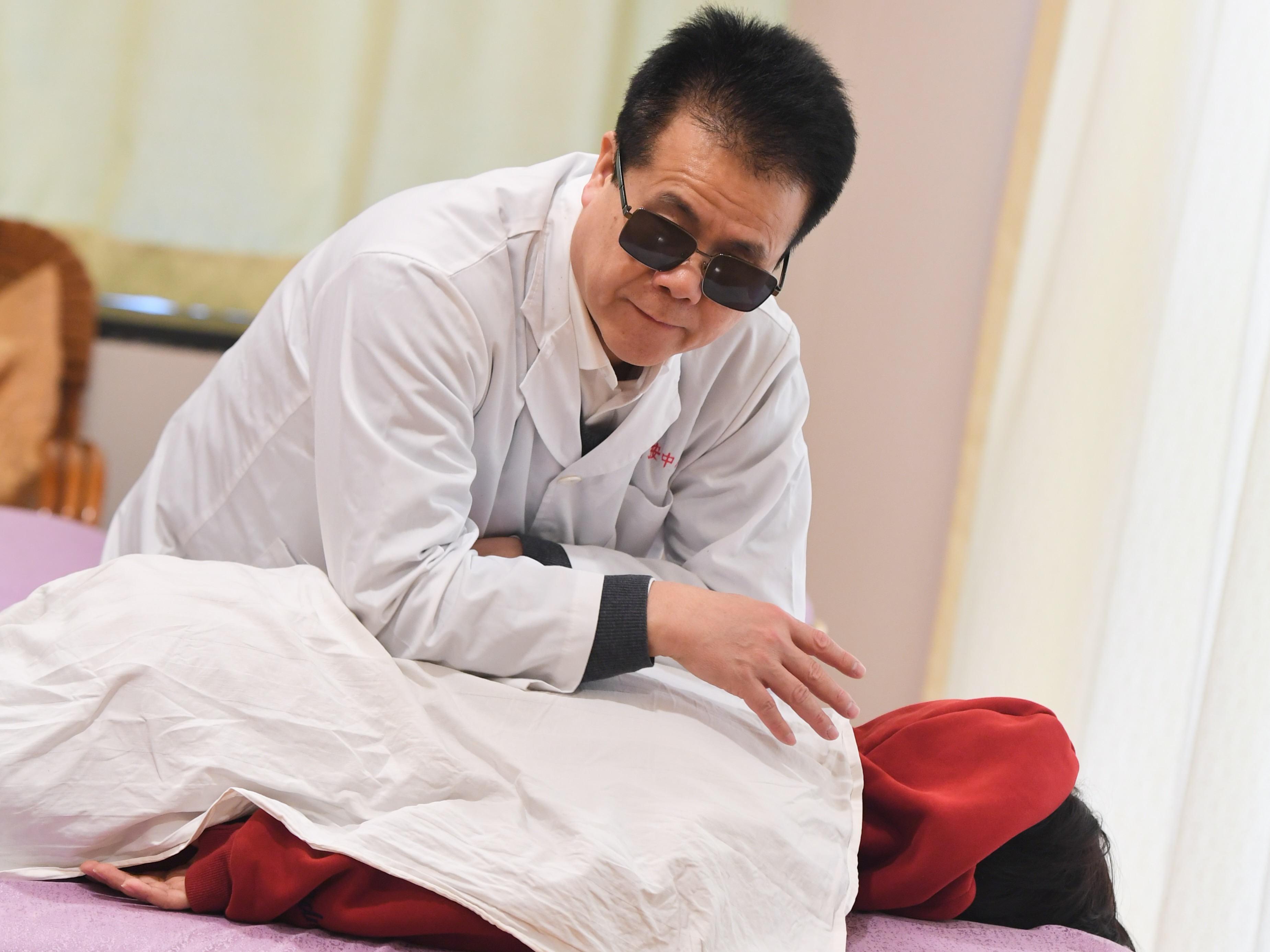 王永澄在福州市海峡盲人按摩指导中心为盲人朋友演示盲按手法(2月6日摄)。