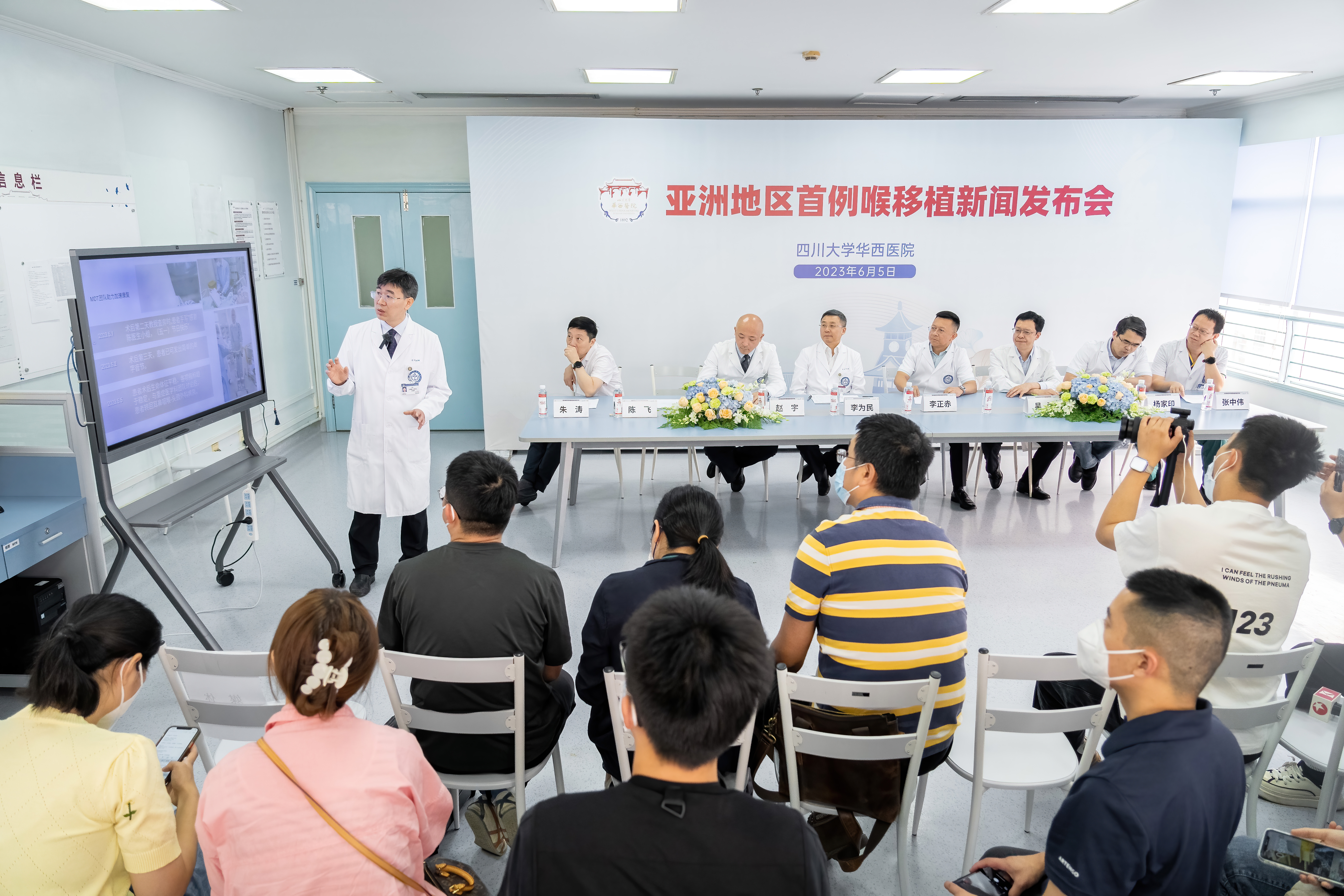 6月5日,四川大学华西医院召开“亚洲首例喉移植新闻发布会”,记者从发布会上获悉,该院耳鼻咽喉-头颈外科陈飞教授团队近日为一名喉癌术后复发的65岁男性成功实施了异体喉-气管-甲状腺联合移植手术,术后,患者恢复良好,异体喉、气管、甲状腺成功存活,功能发挥正常。