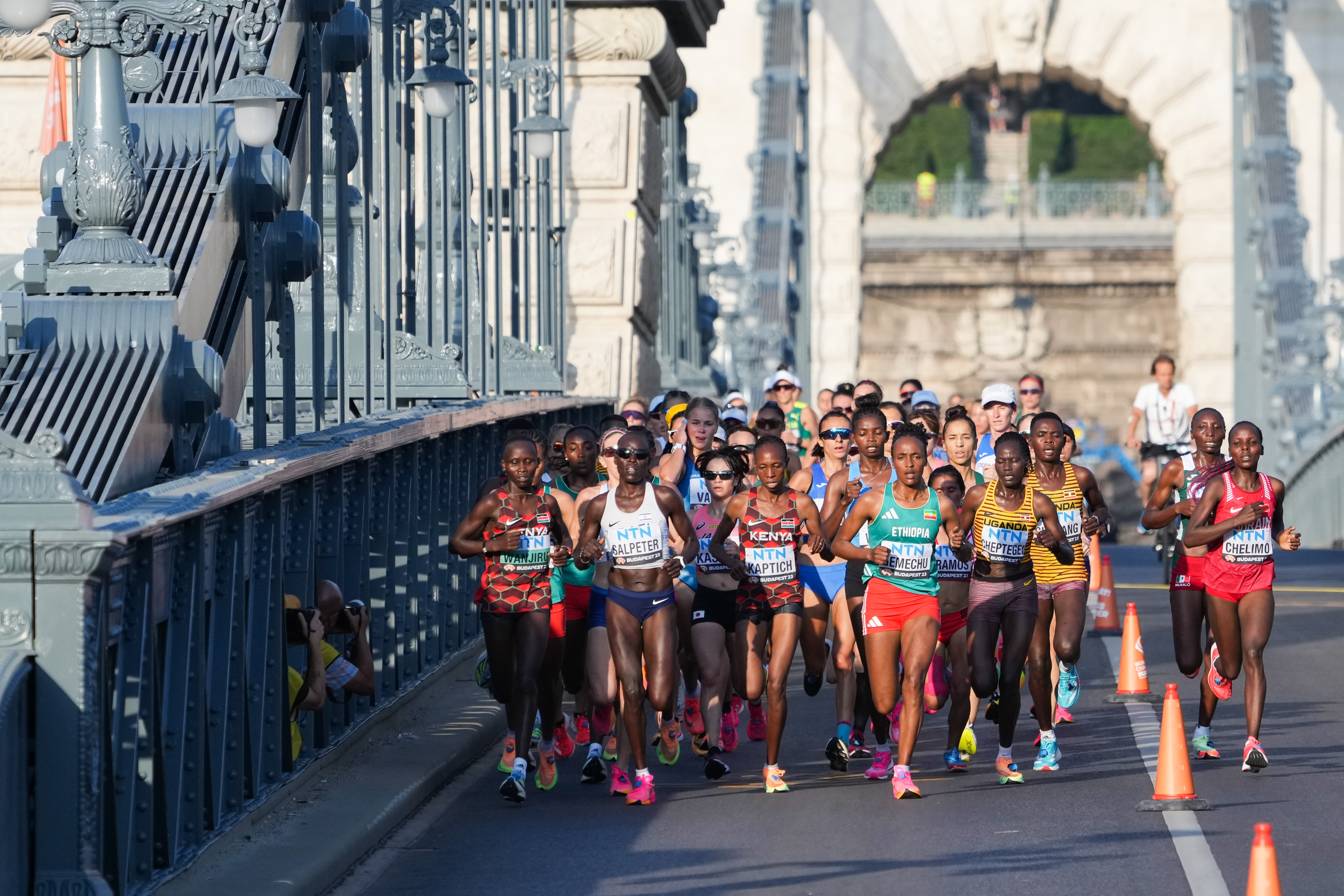 8月26日,参赛选手在比赛中跑过布达佩斯地标链子桥。新华社记者 郑焕松 摄