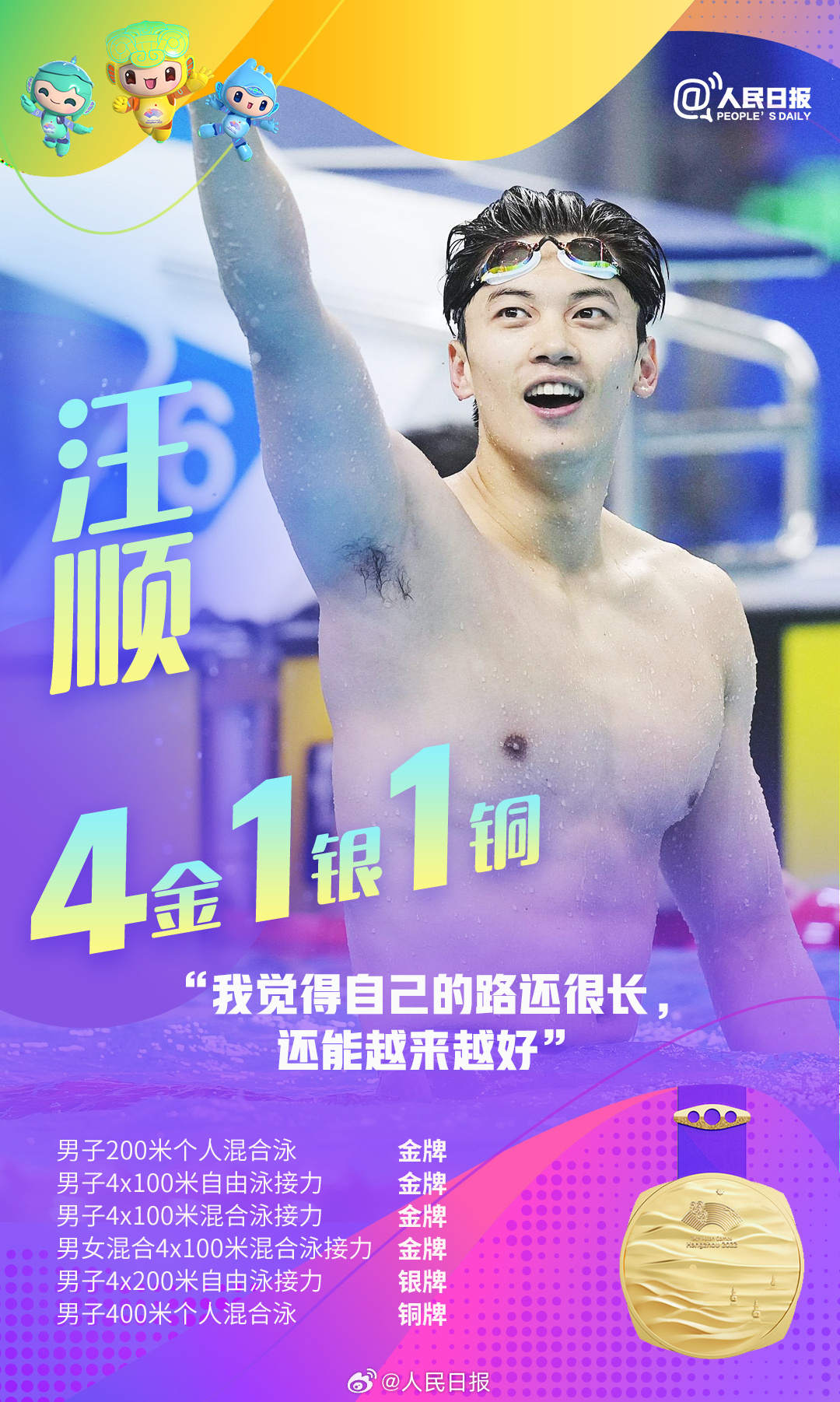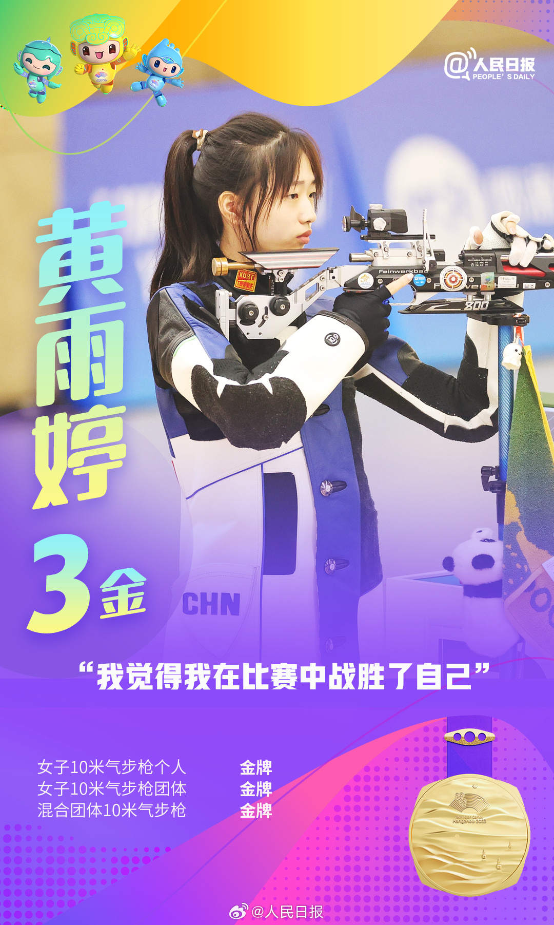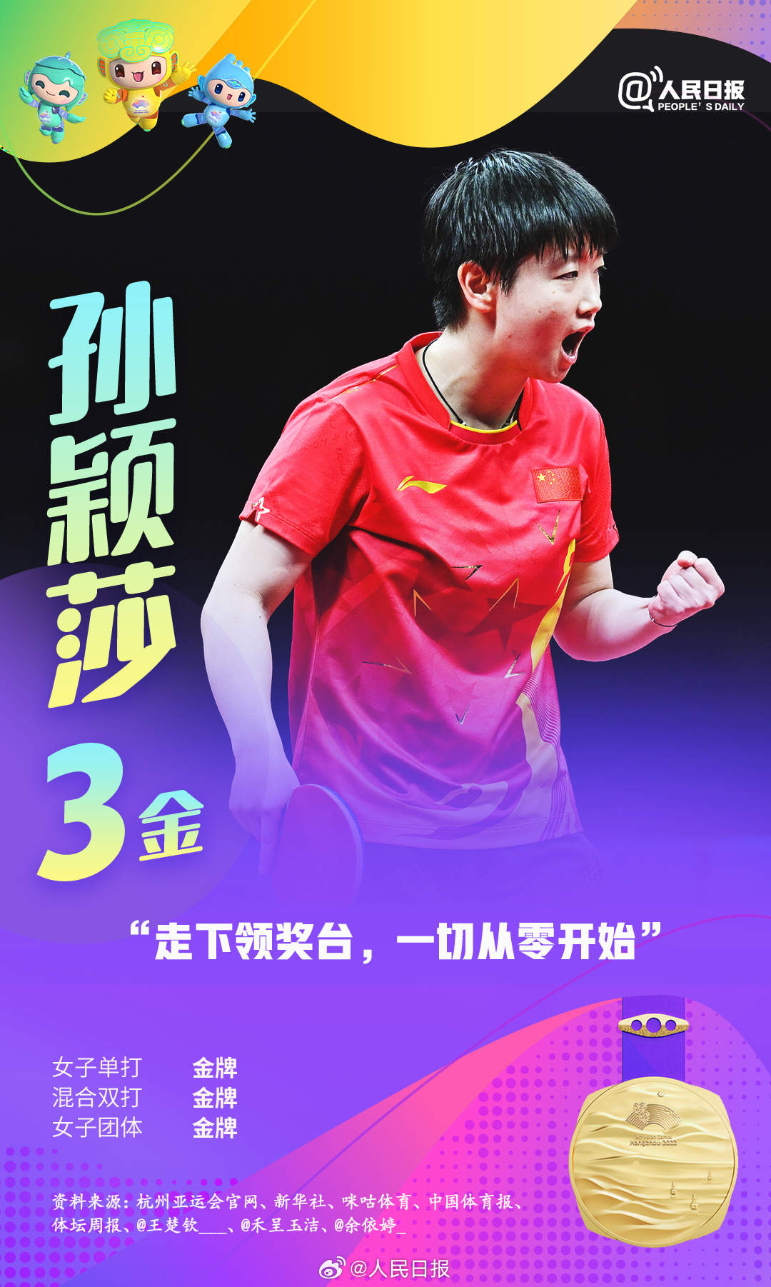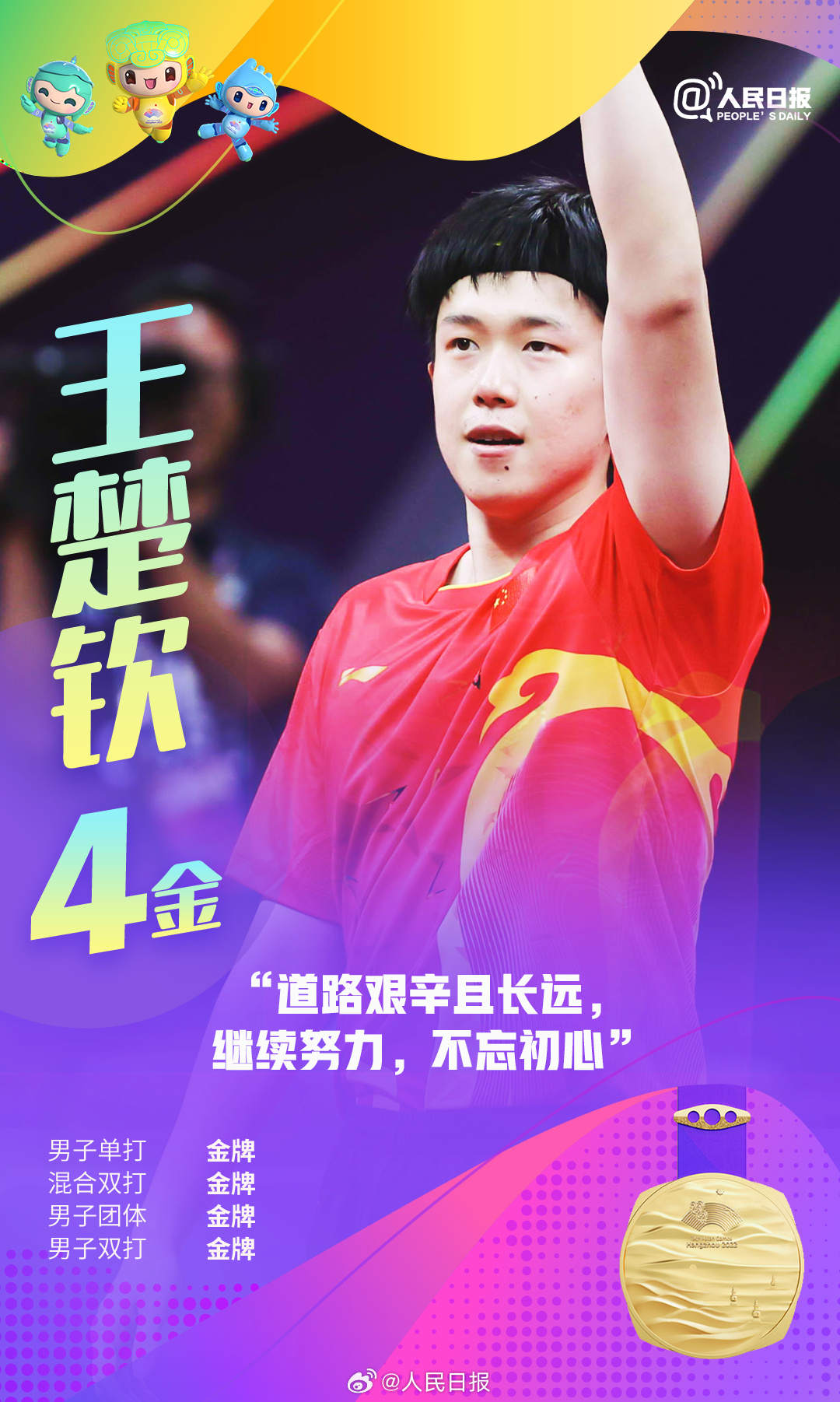 杭州亚运会进行中,中国队持续领跑奖牌榜,多位亚运健儿频频摘金夺银。张雨霏六金收官,王楚钦包揽四金,年仅17岁的黄雨婷成为杭州亚运会上的首个“三冠王”……网友直呼:他们是来亚运批发奖牌的吧!荣誉背后是无数艰辛付出,祝贺中国队,致敬所有拼搏!