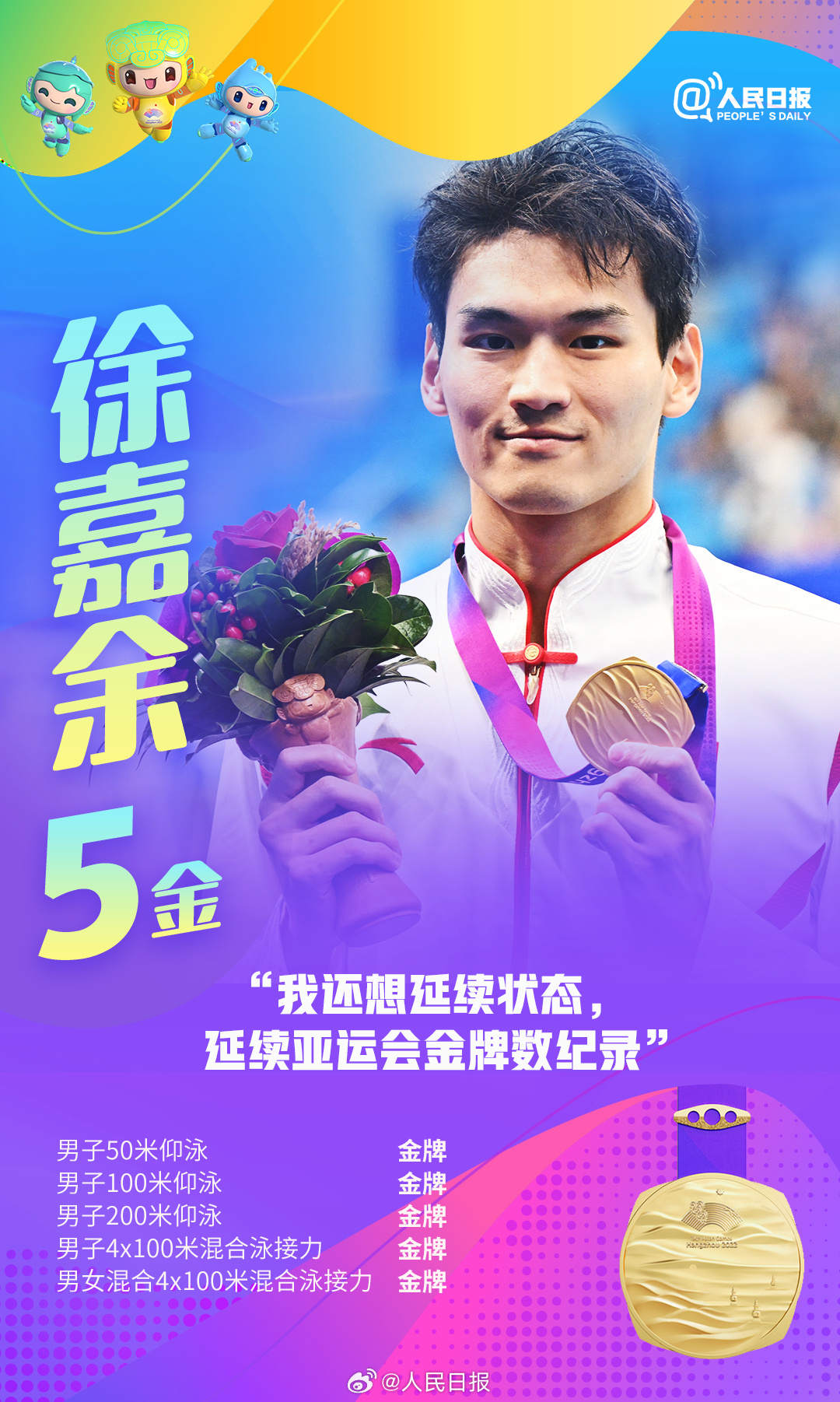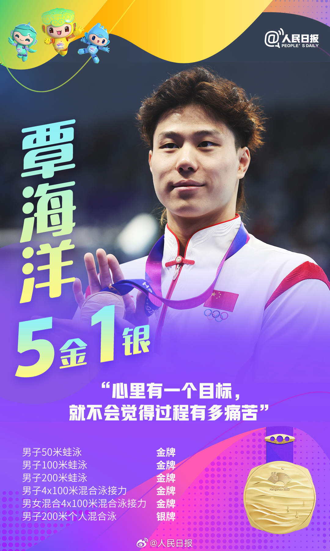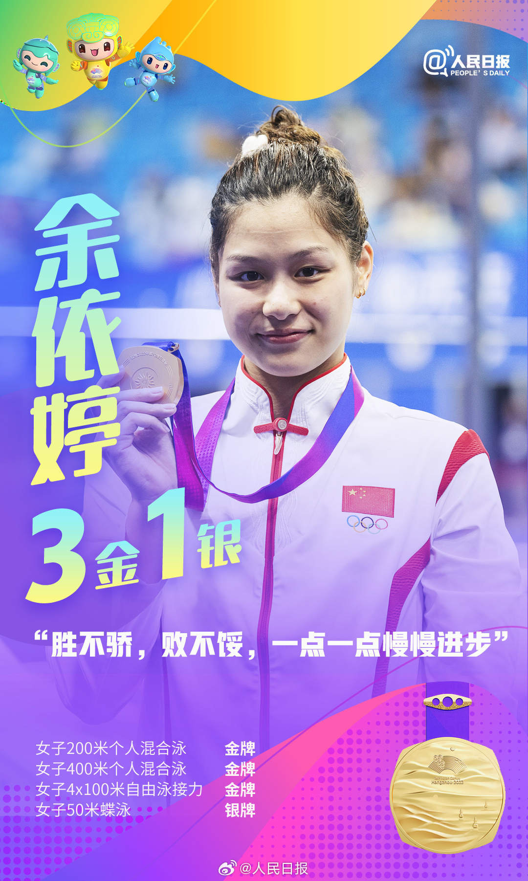 杭州亚运会进行中,中国队持续领跑奖牌榜,多位亚运健儿频频摘金夺银。张雨霏六金收官,王楚钦包揽四金,年仅17岁的黄雨婷成为杭州亚运会上的首个“三冠王”……网友直呼:他们是来亚运批发奖牌的吧!荣誉背后是无数艰辛付出,祝贺中国队,致敬所有拼搏!