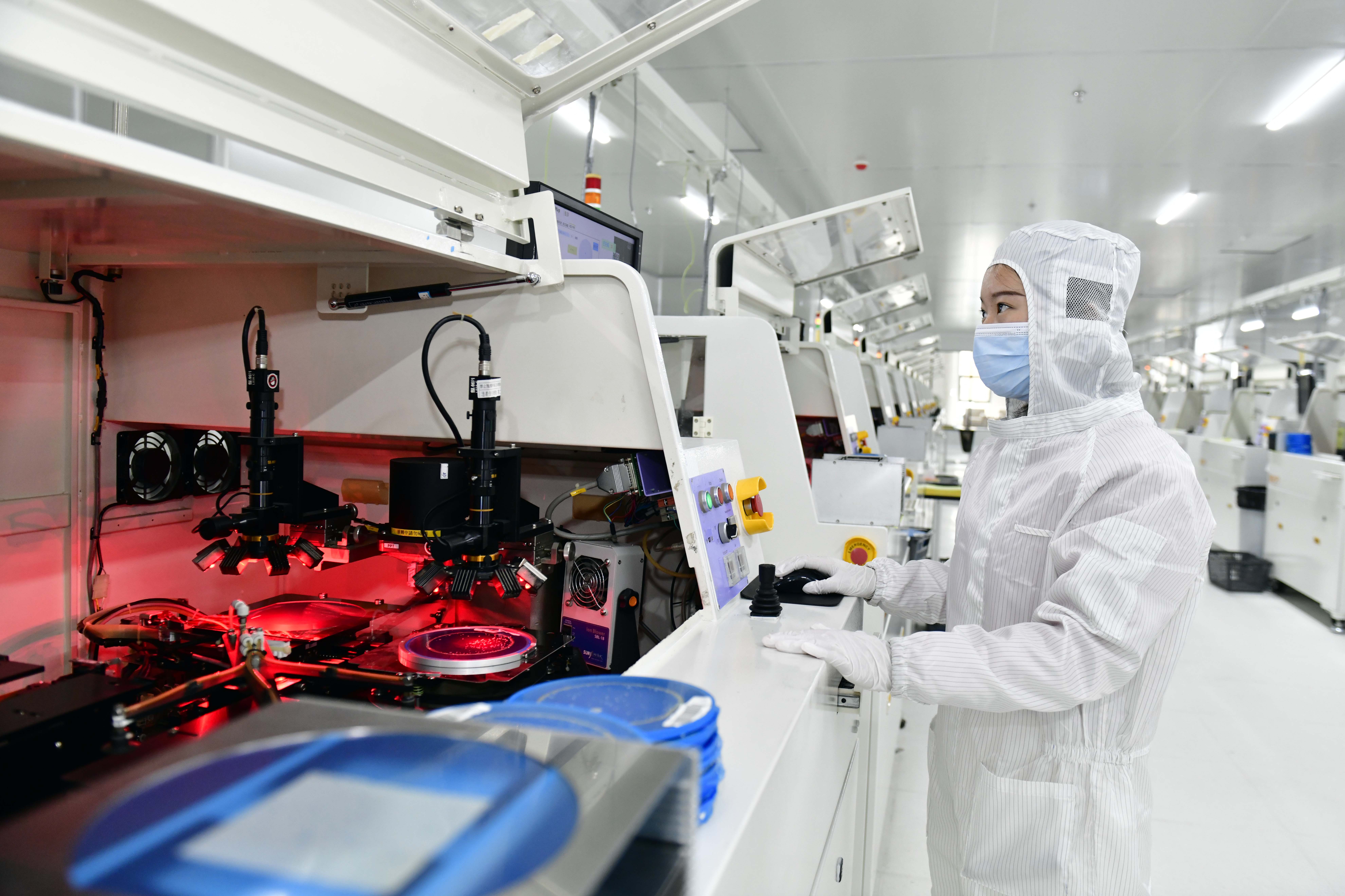 在山东省巨野县新一代信息技术产业园,工作人员在直显芯片生产设备前值守(2023年11月30日摄)。新华社记者 郭绪雷 摄