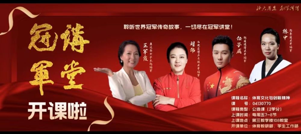 2023秋季学期,为了促进冠军精神走进校园,帮助同学们从体育运动中汲取成长的力量,北京大学体育教研部、北京大学学生工作部与北京大学团委将继续面向全校师生,联合开设“冠军讲堂”——《体育文化与创新精神》公选课,拟邀请任子威、陈中、王军霞等世界冠军分享他们追梦夺冠的故事。