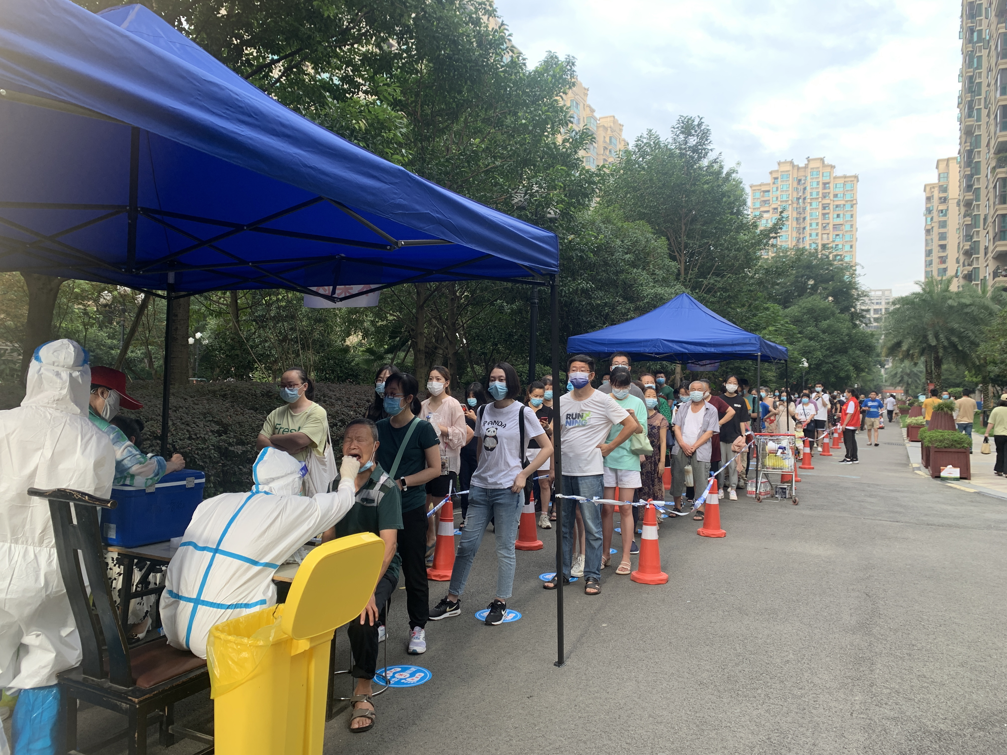 7月20日,成都市青羊区全域开展全员免费核酸检测。早上五点多,在光华东五路的一个小区里,工作人员们就陆续抵达核酸检测点,做起了准备工作。7点多,排队做核酸的队伍逐渐拉长。
