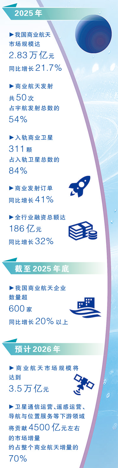 从古至今,中国人探索浩瀚宇宙的脚步从未停歇。商业航天是培育新质生产力、建设航天强国的重要力量。2015年《国家民用空间基础设施中长期发展规划(2015—2025年)》印发,鼓励社会资本步入航天领域;2025年我国商业航天完成发射50次,占我国全年宇航发射总数的54%;2026年,国家航天局在“中国航天日”新闻发布会上介绍,多型重复使用火箭将开展飞行验证,商业航天将以高水平安全保障高质量发展……10年来,我国商业航天加速成长,新技术、新突破、新应用不断涌现,从星辰大海走进千家万户。目前我国商业航天有何前沿进展?哪些曾经的太空畅想正照进现实?本期特别报道,我们共同关注。