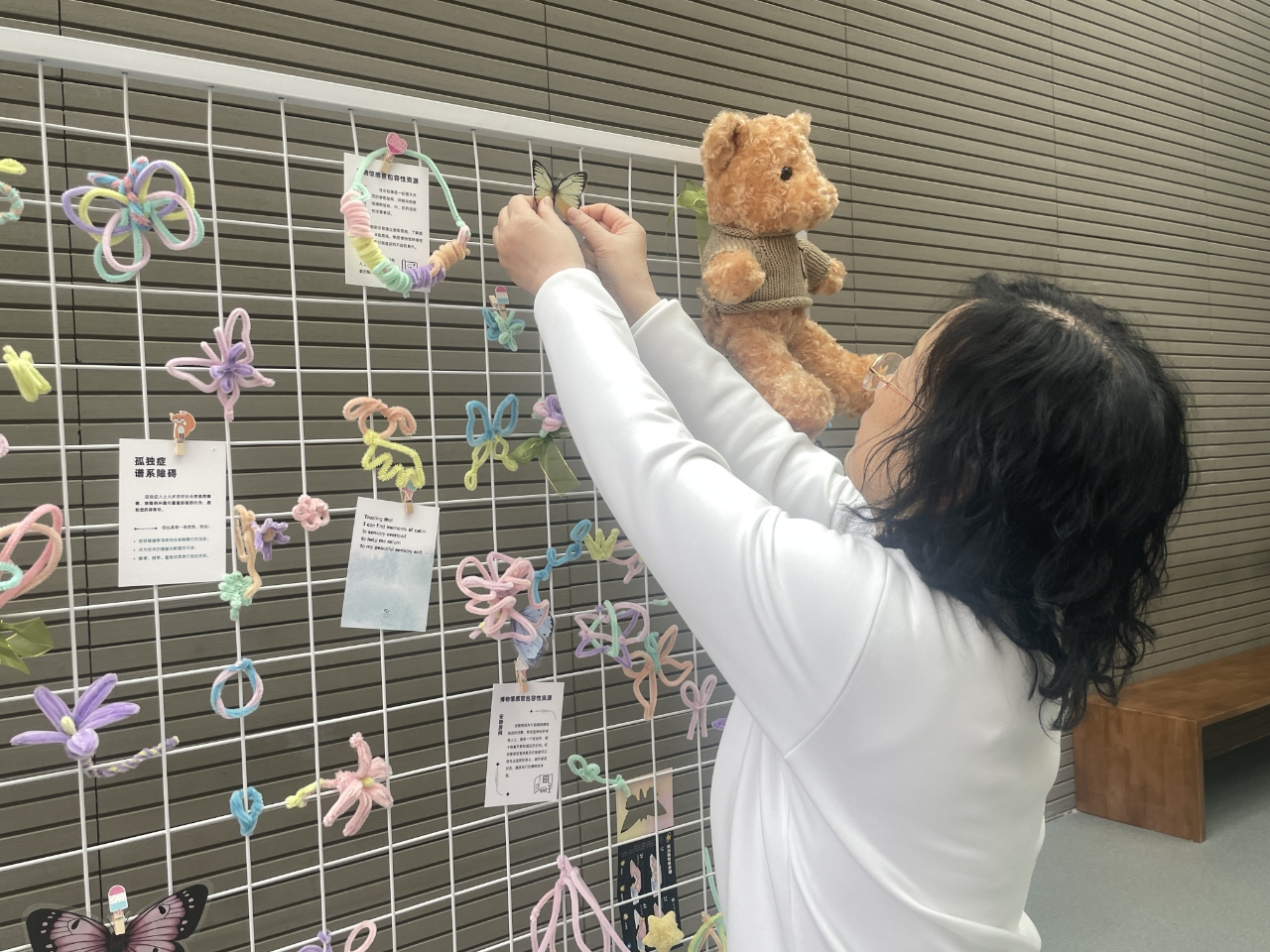 二楼的“星星科普区”则是知识与趣味完美融合的地方。志愿者们通过口袋问答卡片与观众进行互动,以生动有趣的方式传播知识。宣传板上,一幅幅漫画直观地展示了与孤独症儿童正确相处的技巧和方法。孩子们手持毛绒扭扭棒,发挥想象力进行创作。志愿者们耐心地向家长们解释,每一个作品都是孩子们探索世界、表达自我的独特方式。