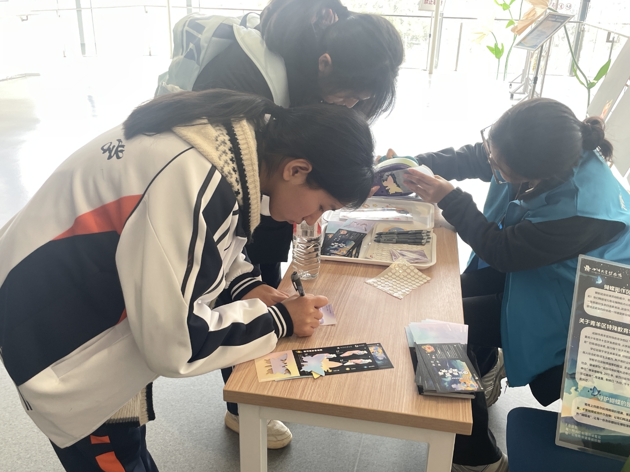当人们步入三楼的“蝴蝶画作展区”,仿佛进入了一片艺术的星河。此处展出了36幅来自孤独症学生的画作,每一幅都如星河般璀璨夺目。观众被这些画作深深吸引,纷纷驻足观赏,并在蝴蝶压花卡片上写下自己的感悟与祝福。据悉,这些卡片将被制作成艺术装置和电子画册,成为孤独症学生与社会沟通的独特纽带。