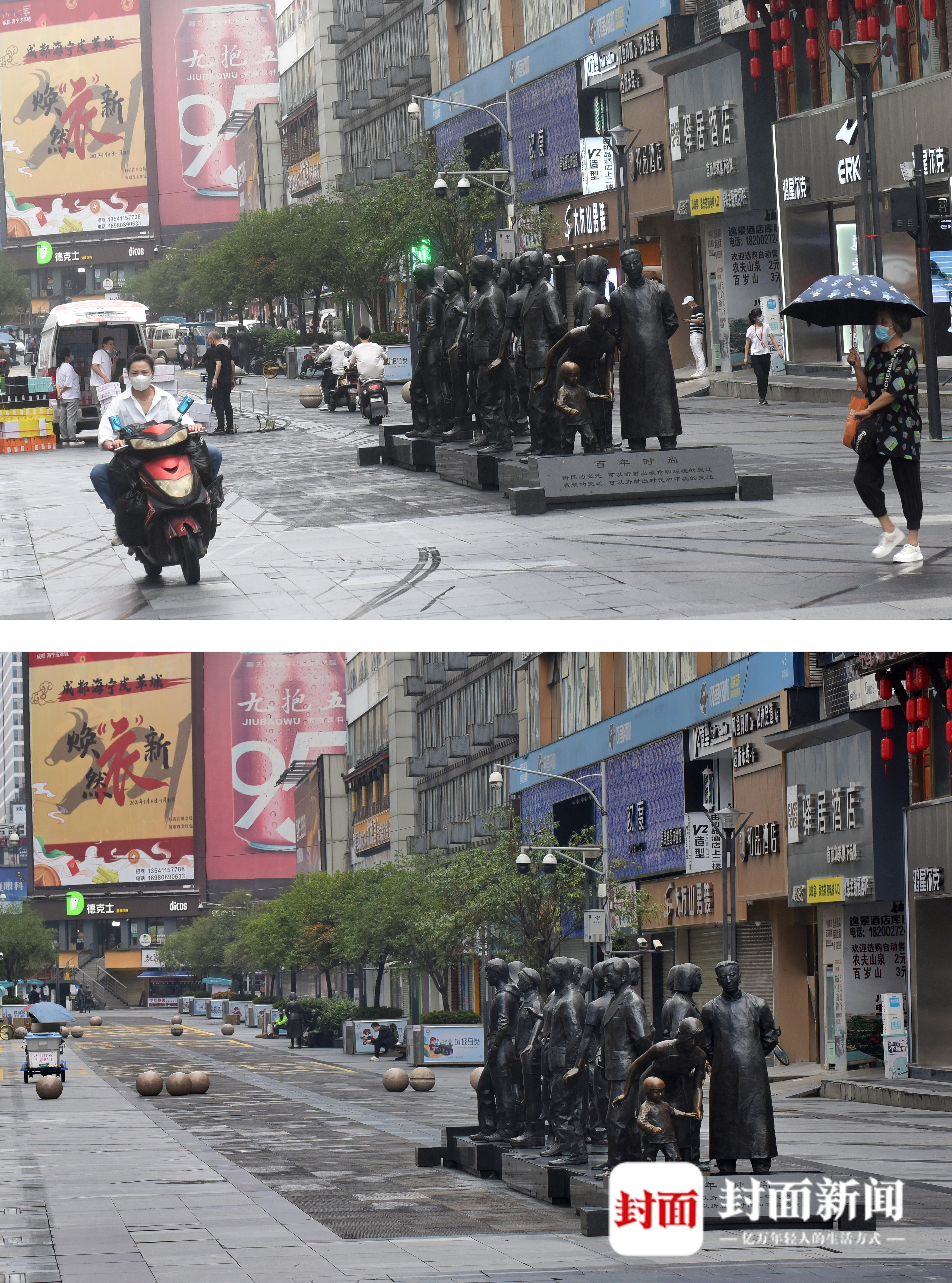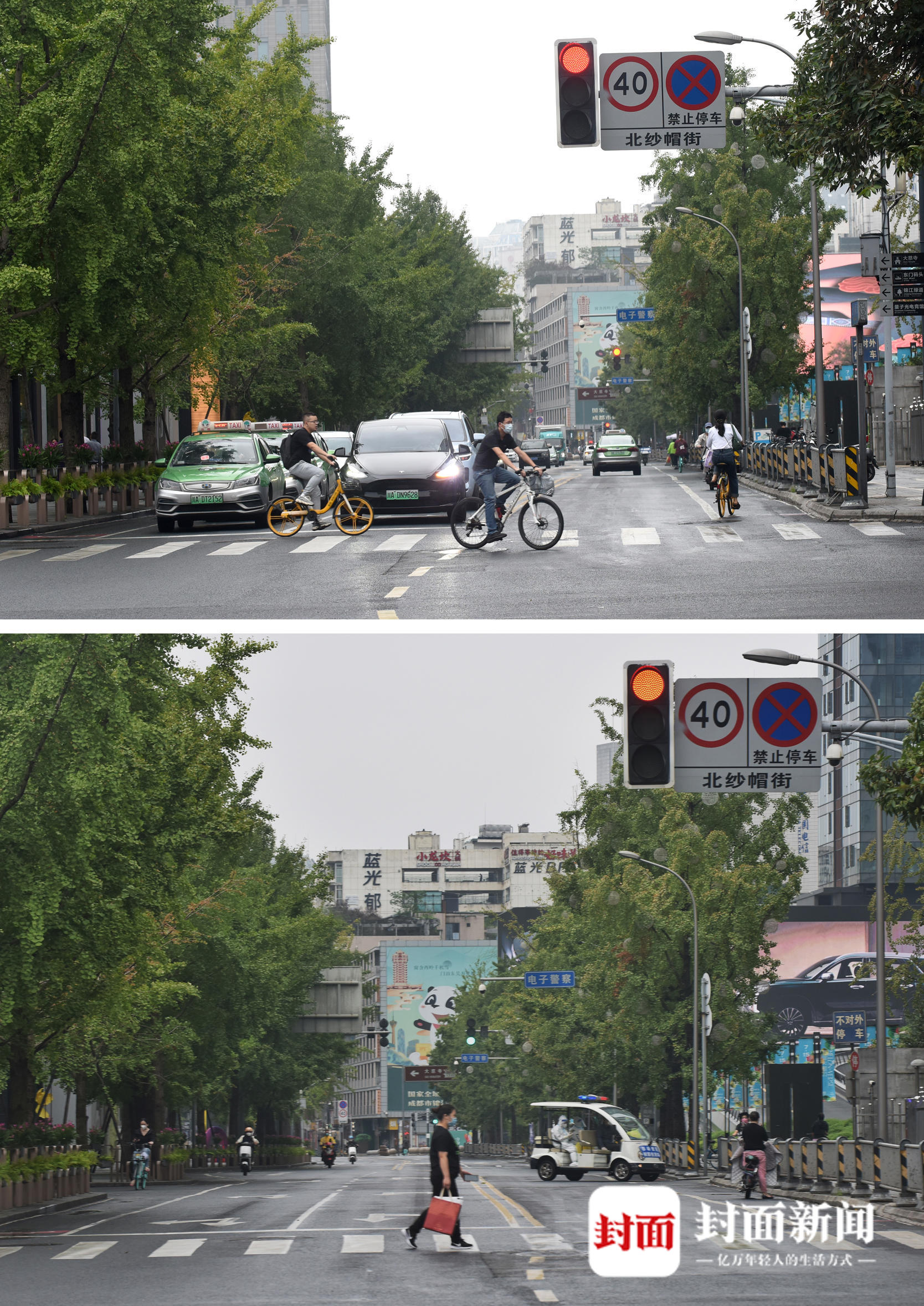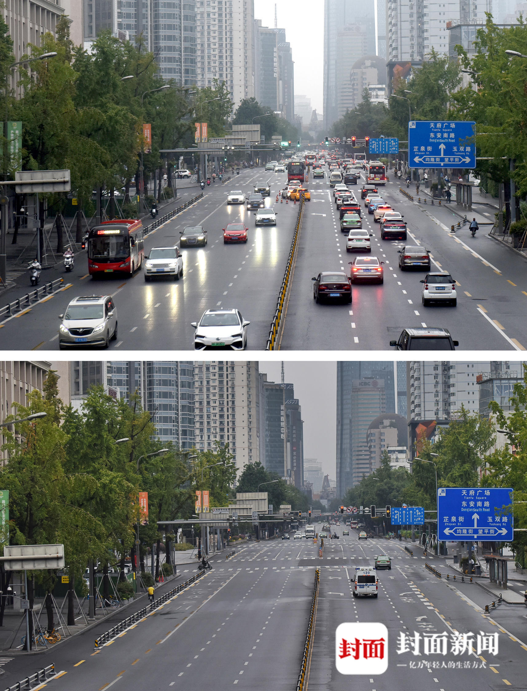 9月19日,一组对比图片,再现成都由“慢下来,静下来”到全面有序恢复生产生活秩序的景象。那个车水马龙、极具烟火气的城市,正在归来。