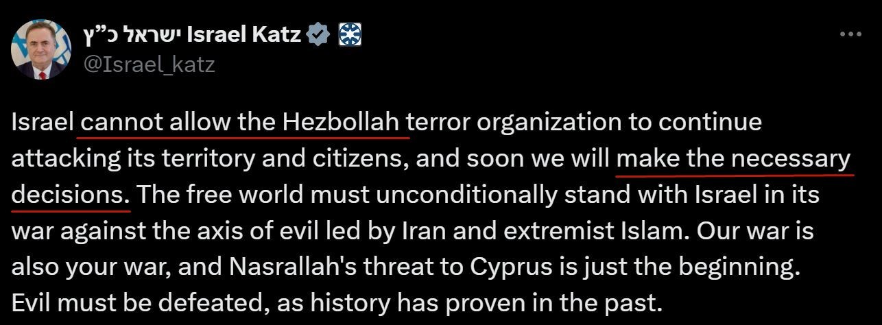 继以色列18日警告即将对黎巴嫩开启“全面战争”后,以外长卡茨21日又发表声明称,以色列不允许黎巴嫩真主党继续袭击其领土和人民,以方将很快就此做出必要的决定。