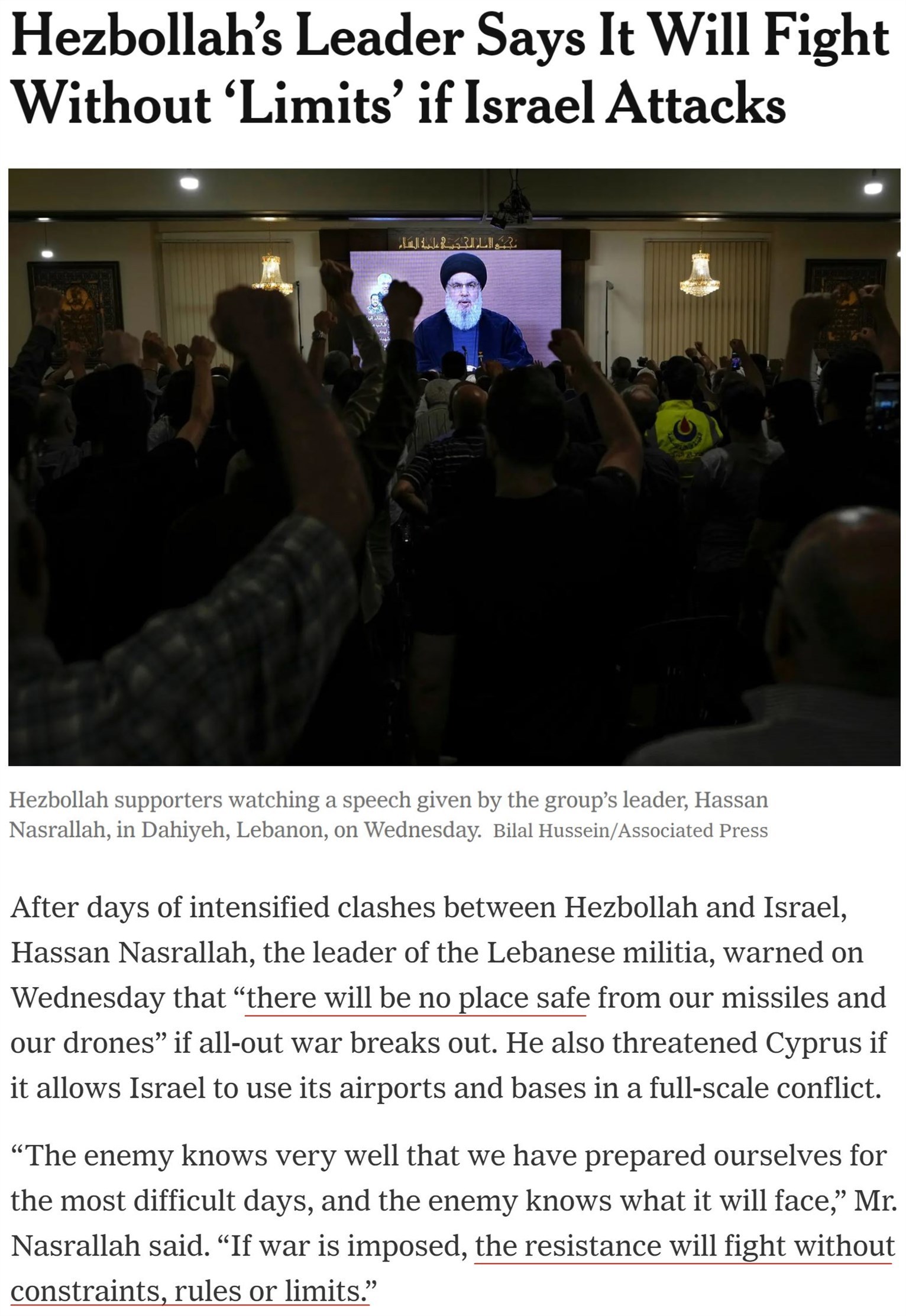 “如果黎巴嫩被迫开战,我们将不受约束地进行战斗。以色列知道其境内没有什么地方能躲过我们的导弹和无人机。”