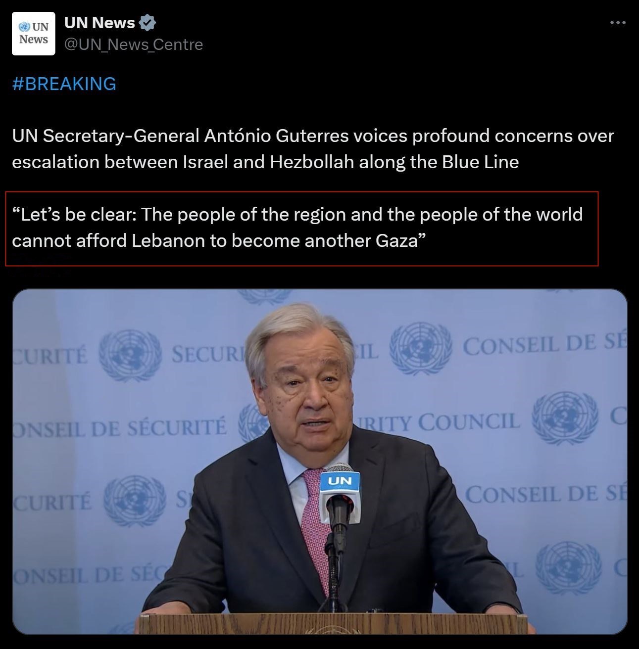 “让我们明确一点:中东人民和世界人民无法承受黎巴嫩成为另一个加沙。”