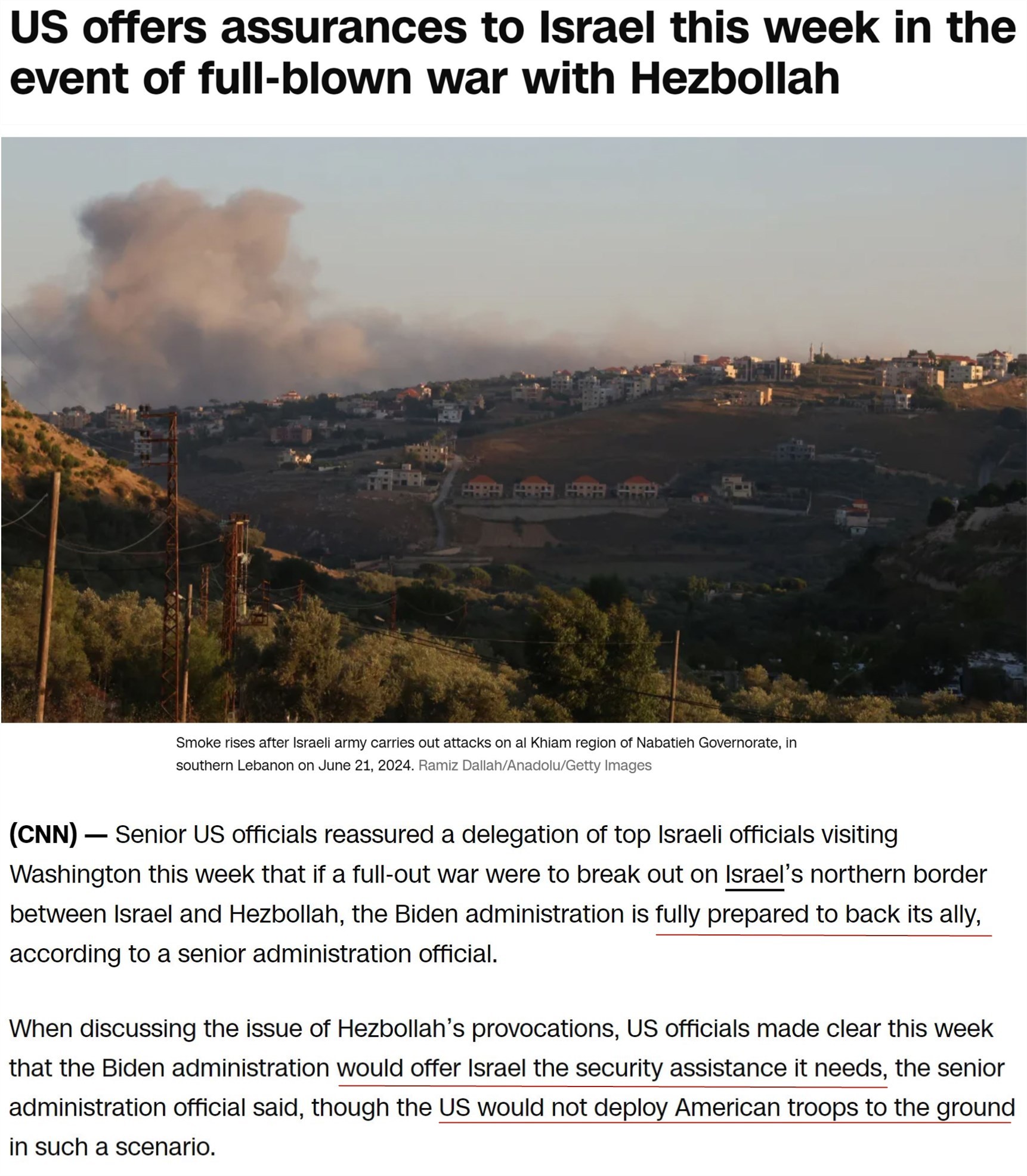 尽管美国多次宣称,正在努力避免黎巴嫩真主党和以色列之间爆发“更大的战争”,但据美国有线电视新闻网21日报道,美方高级官员已向近期访美的以色列代表团明确保证,如果以色列和真主党爆发全面冲突,美国虽然不会派兵,但已做好充分准备支持自己的盟友,将满足以方的一切安全需求。