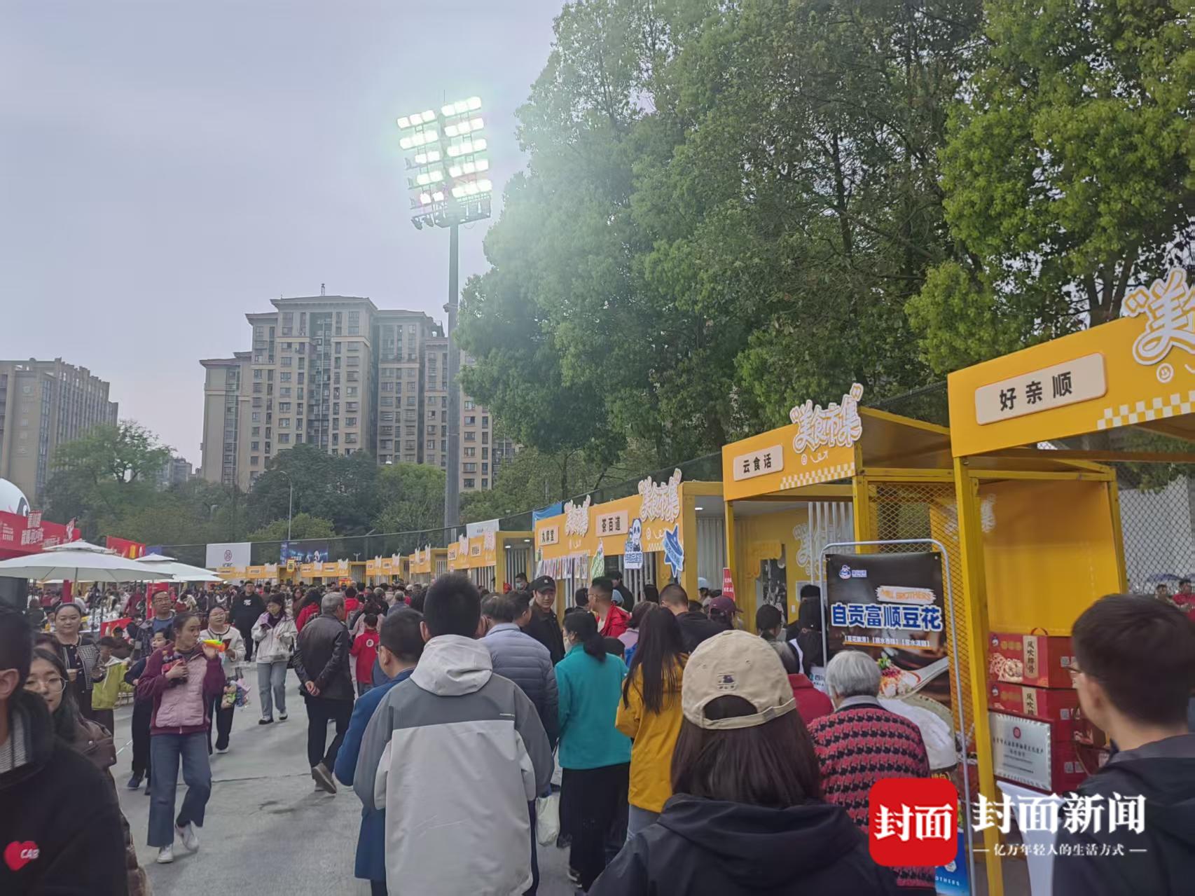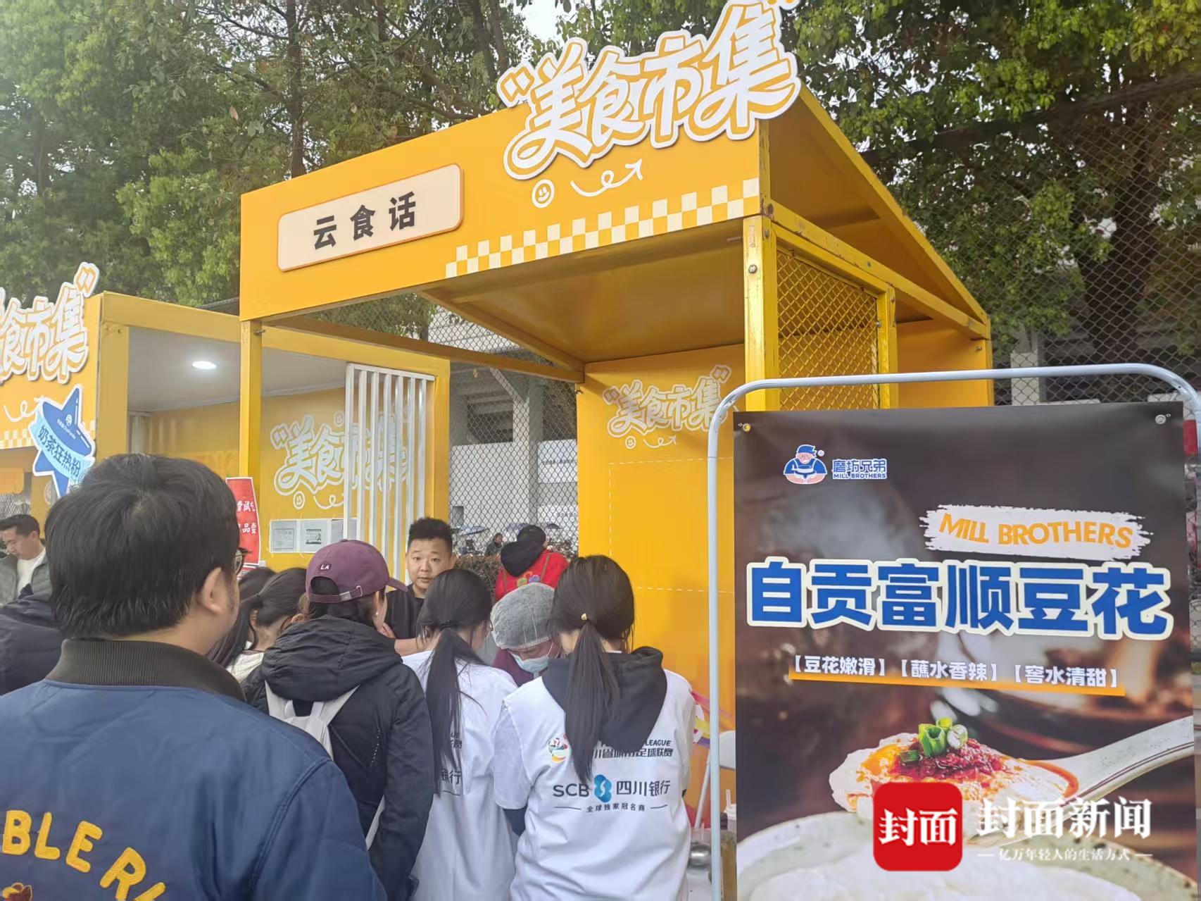 比赛还未开始,赛场外已是热闹非凡。在“川超”嘉年华现场,一个个充满地方特色的美食摊位前围满了球迷。