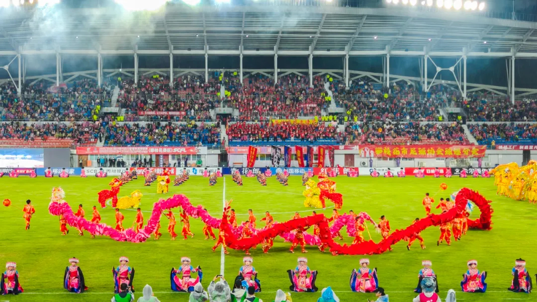 现场,8条巨龙与8只南狮欢腾入场,气势磅礴。其中,“攀枝花龙”以英雄花为鳞,舞动似火,尽显城市的坚毅豪迈;“异木棉花龙”身披粉黛,摇曳生姿,舞出漫天花雨的浪漫诗意。龙狮齐舞,瞬间点燃全场。