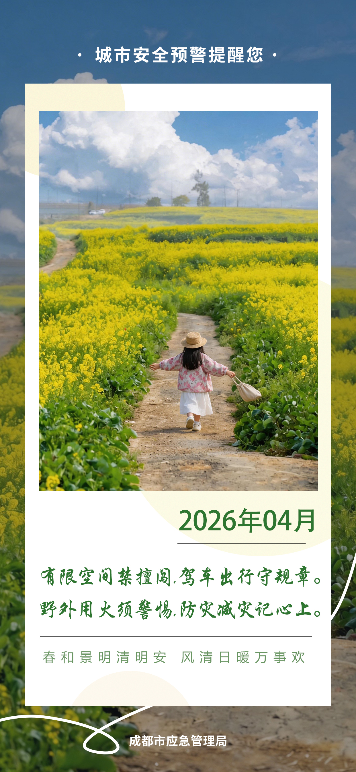 4月,气温快速回升,强对流天气多发,春假与清明假期叠加,群众踏青出行、祭祀活动集中,各类风险交织。成都市安办(市防减救灾办)提醒广大生产经营单位和市民朋友重点防范五个方面主要安全风险。