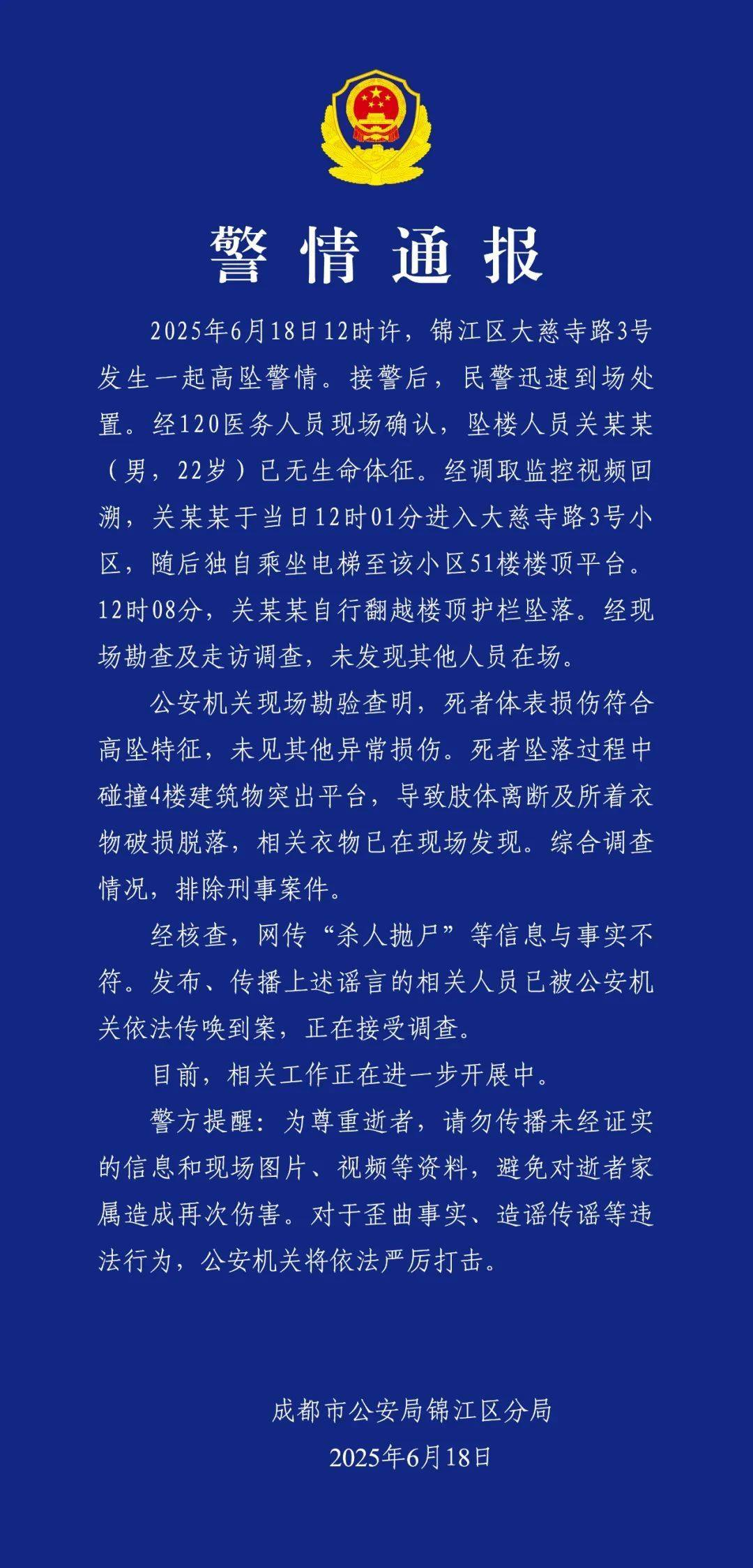 6月18日,成都市公安局锦江区分局通过微信公众号“成都锦江公安”发布警情通报称,死者体表损伤符合高坠特征,未见其他异常损伤。死者坠落过程中碰撞4楼建筑物突出平台,导致肢体离断及所着衣物破损脱落,相关衣物已在现场发现。综合调查情况,排除刑事案件。