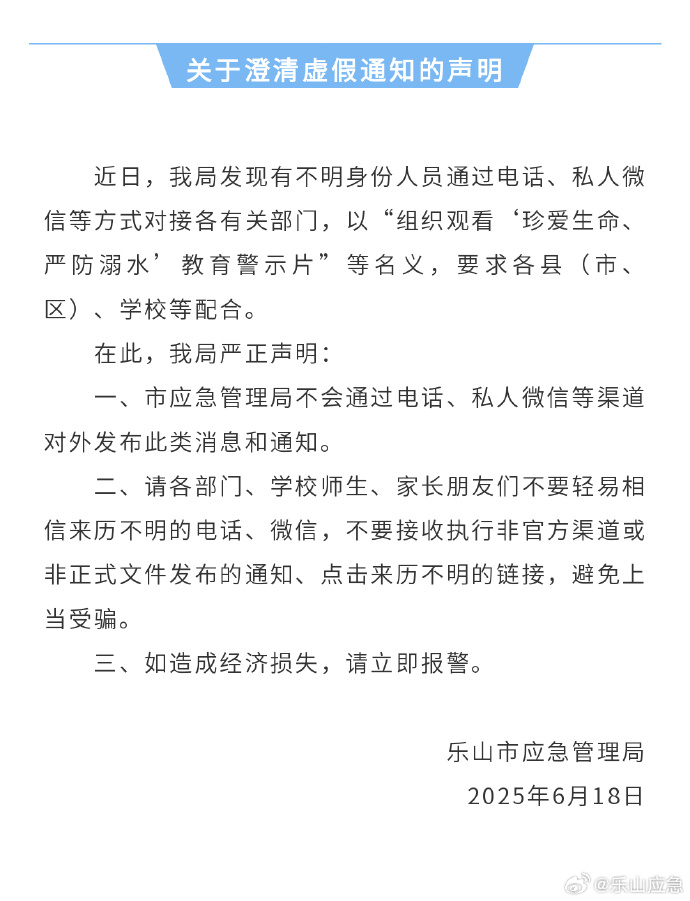 详情:6月18日,@乐山应急 发布关于澄清虚假通知的声明。声明如下:
