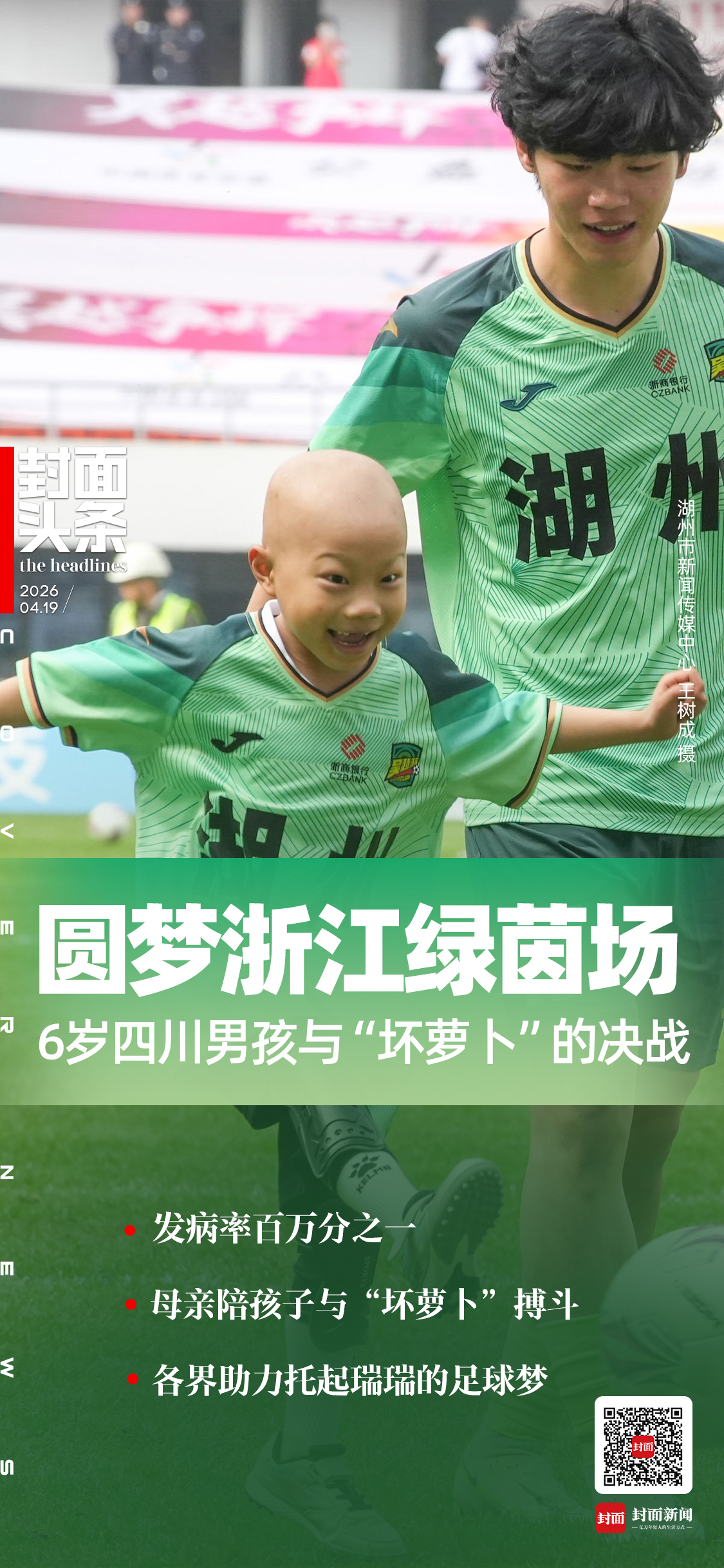 中场休息时间,随着现场激情澎湃的播报,全场球迷的目光聚焦在球场中央6岁的四川男孩瑞瑞(化名)身上。身上的浅绿色10号球衣,使他皮肤显得苍白,但仍掩不住激动的笑容。