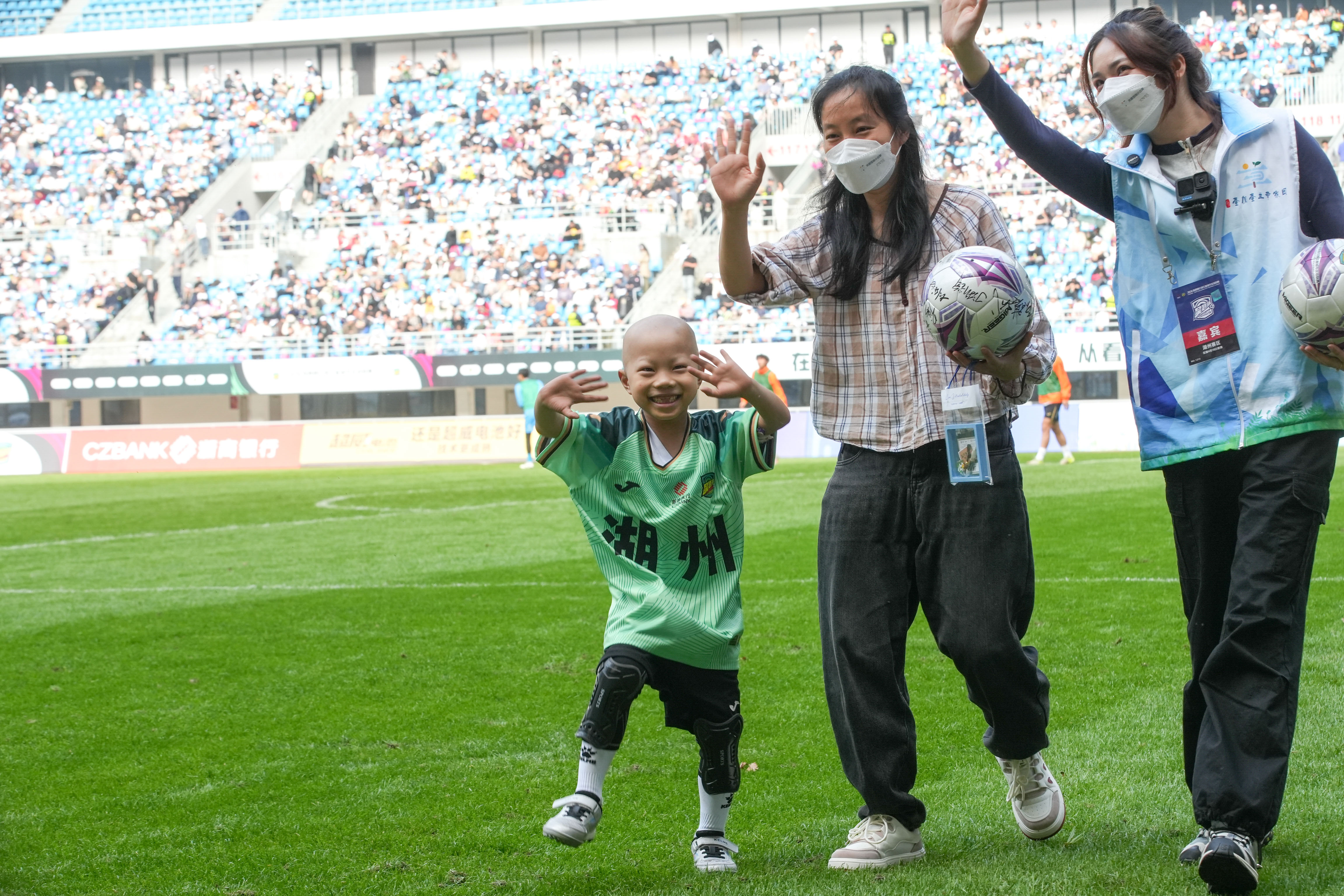 瑞瑞母子接受全场球迷欢呼(湖州市新闻传媒中心 王树成 摄)