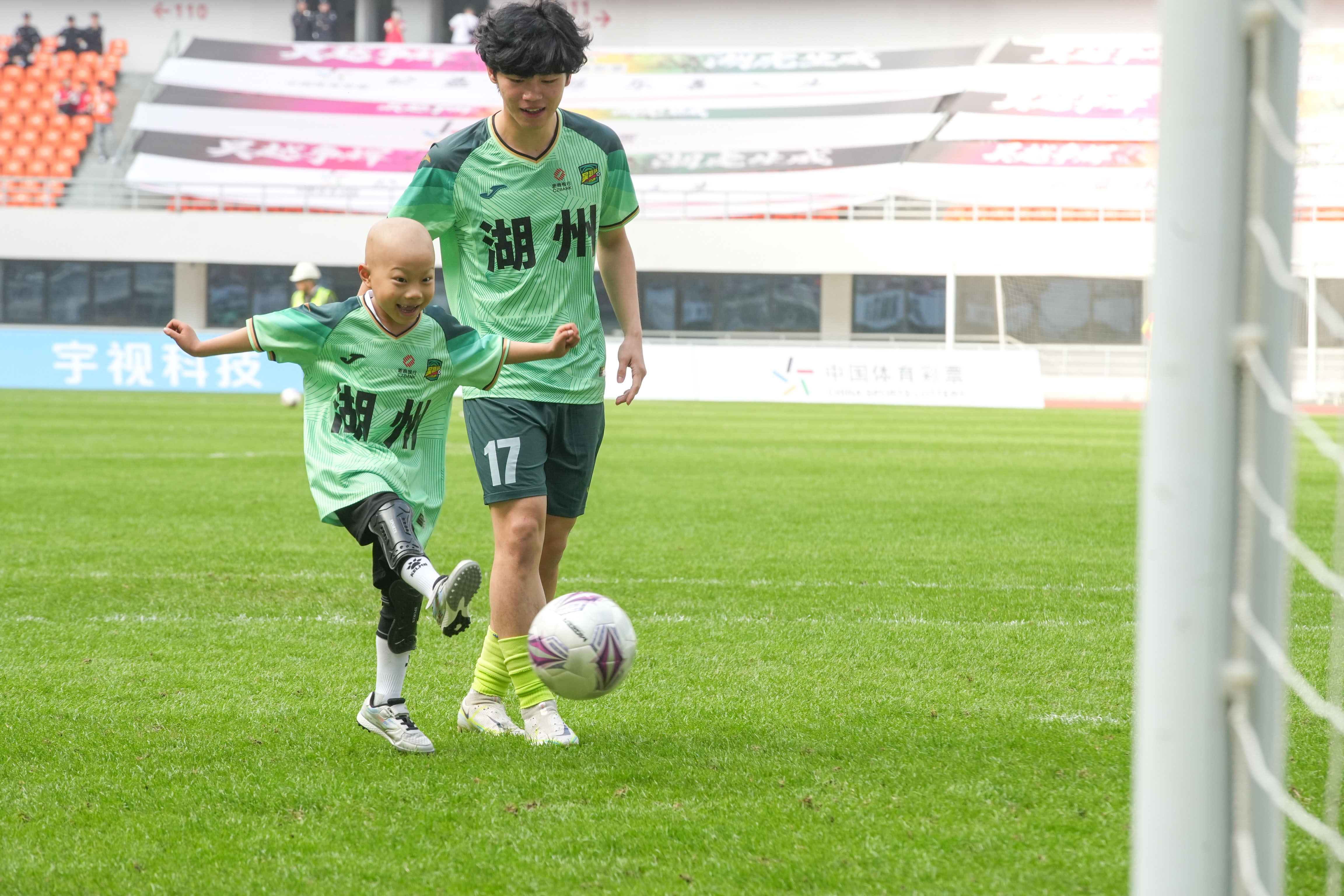 瑞瑞在湖州队球员陪伴下射门(湖州市新闻传媒中心 王树成 摄)