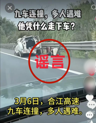 近日,网安大队在工作中发现,抖音平台一账号于3月7日发布视频,声称“3月6日合江高速路段发生九车连撞多人死亡”,该信息迅速引发关注。经民警核实,向负责处理该事故的高速交警部门求证得知:3月6日,G93成渝环线高速(合江县境内)确系发生了一起车辆追尾交通事故,但事故仅造成一人轻微骨折、两人轻微受伤,并无人员死亡,确认该视频内容为不实信息。