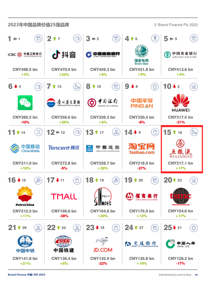 其中,在5月9日全球权威品牌价值评估机构Brand Finance发布的“2023年中国品牌价值500强”报告中,五粮液品牌价值较去年增长17%,达到2171.33亿元,连续7年保持品牌价值正增长;品牌评级达到最高等级AAA+,排名跃升进入前15名。