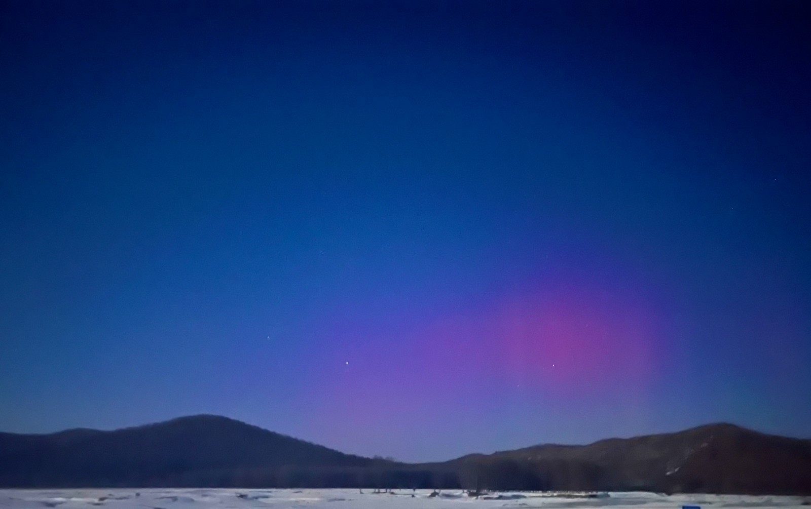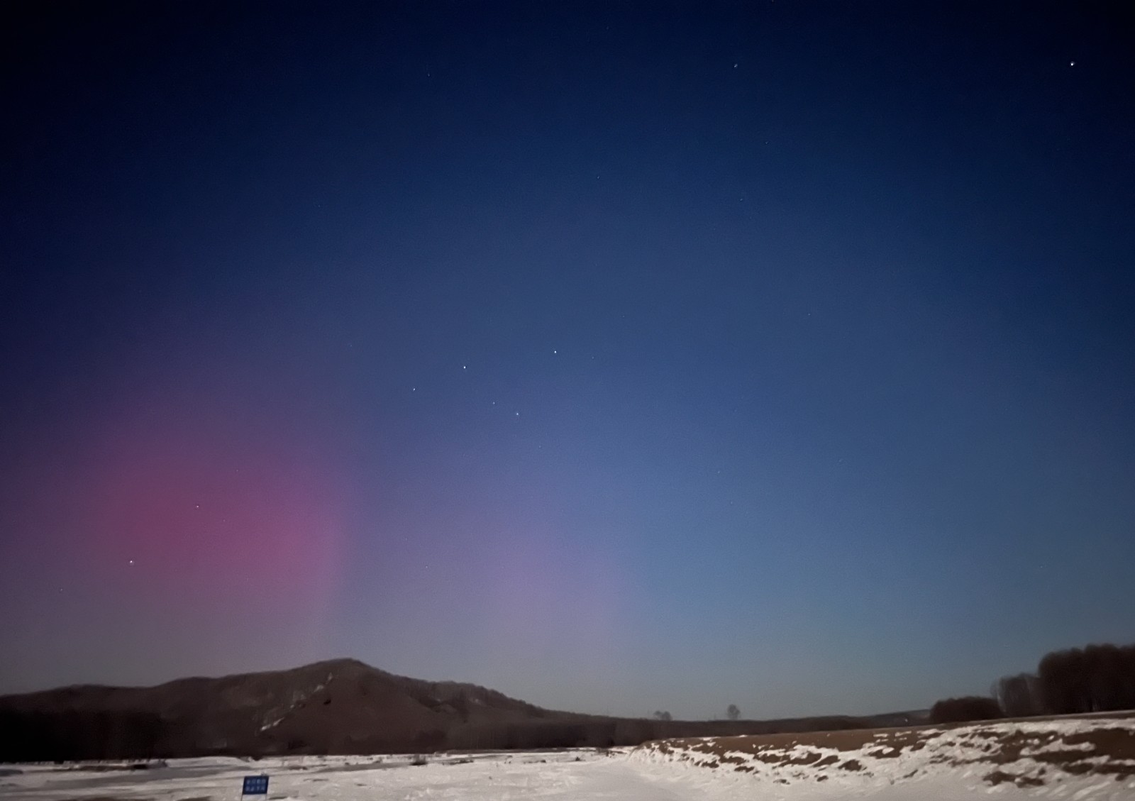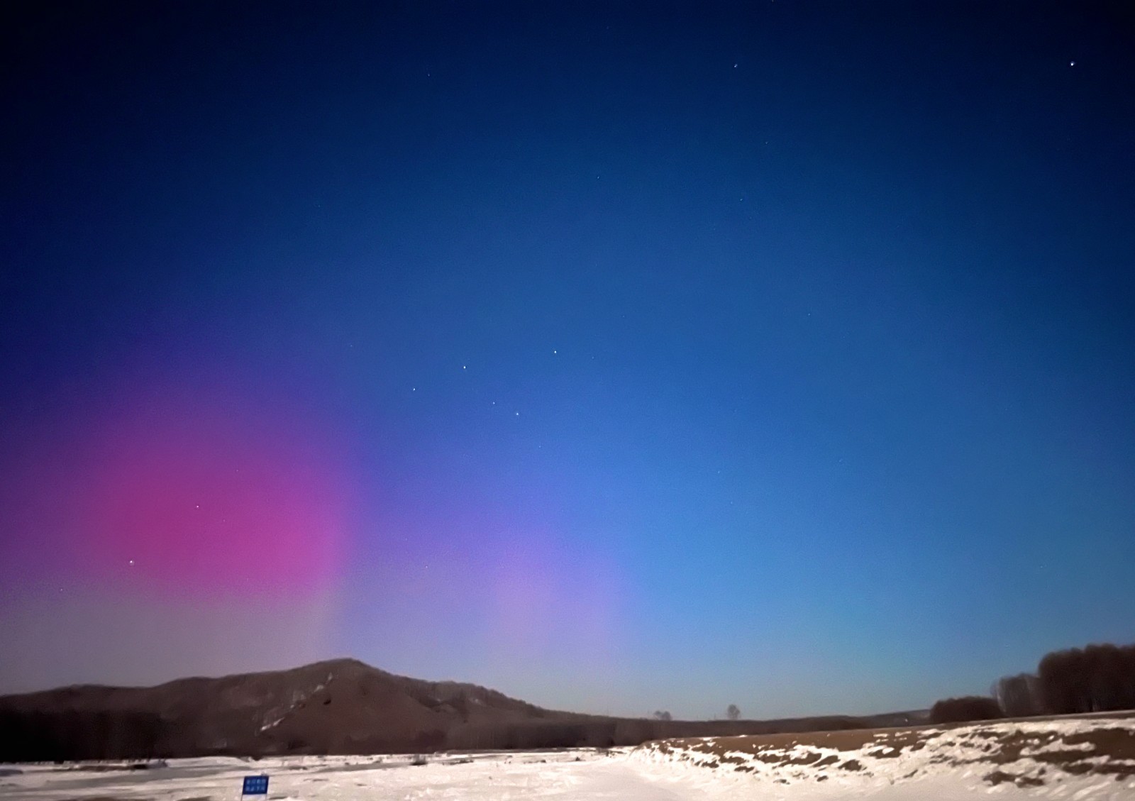 3月25日2点40分,内蒙古根河市再现极光美景,红色的极光好似腮红装扮了湛蓝的夜空,此次极光仅仅露面4分钟,稍纵即逝的美让它更显珍贵、神秘。