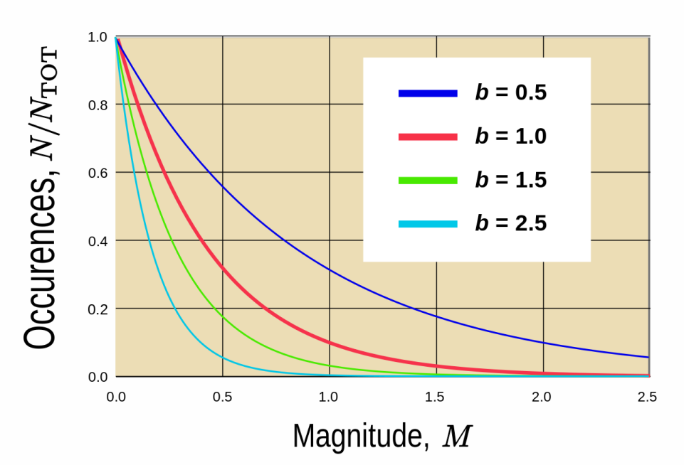 第三个规律被称为古腾堡-里克特定律(Gutenberg-Richter law),这个规律指出了在某一区域内,某一震级地震数量与总地震数量之间的关系,如下公式,其中N为地震数量,M为震级,a和b为常数。