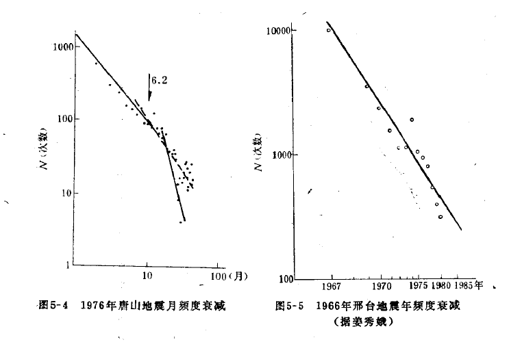 △大森定律与现实观察到的余震衰减频率能很好吻合 图片来源:吴开统,焦远碧等编著. 地震序列概论. 北京:北京大学出版社, 1990.03.