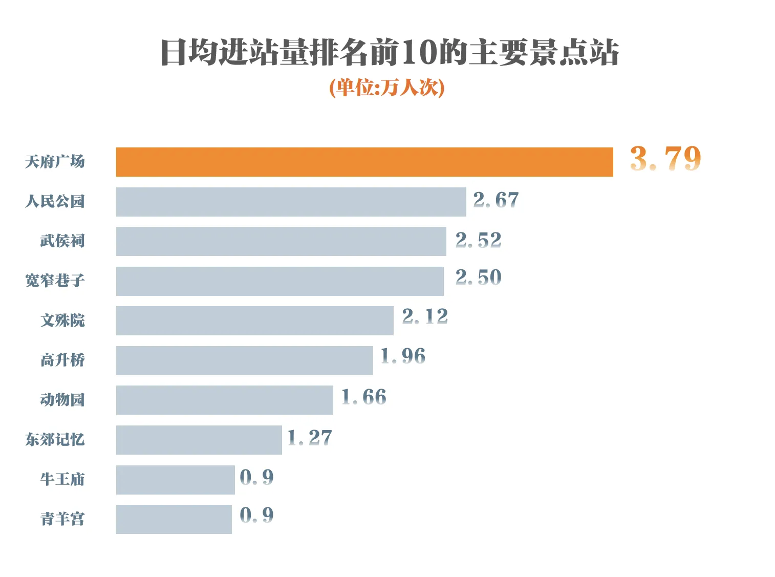 武侯祠站和宽窄巷子站紧随其后,日均进站量分别为2.52万人次、2.50万人次,外地乘客日均进站量分别为1.06万人次、1.11万人次。