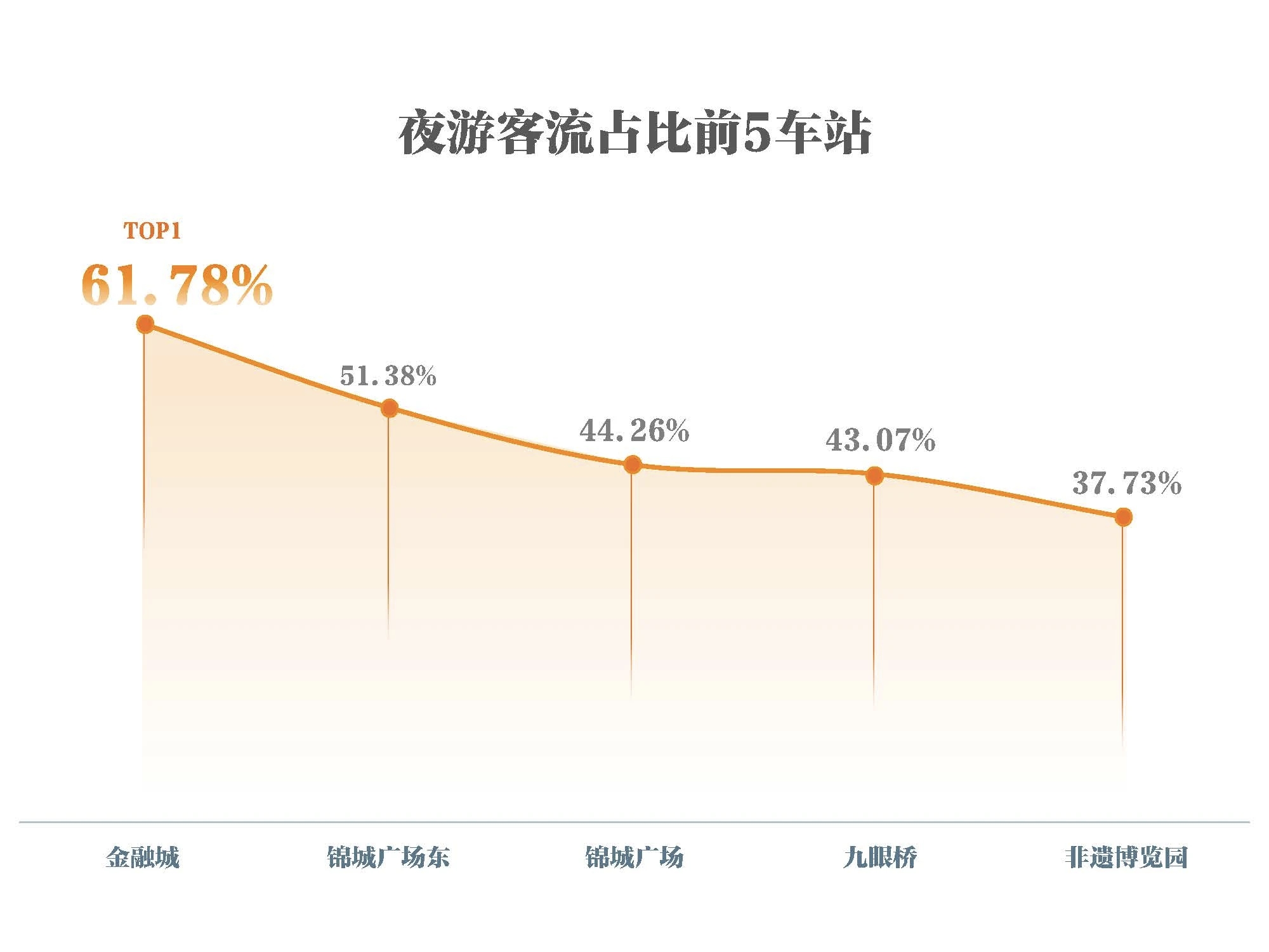 金融城站以61.78%的夜间客流占比领跑全城,锦城广场东站(51.38%)、锦城广场站(44.26%)、九眼桥站(43.07%)、非遗博览园站(37.73%)紧随其后。