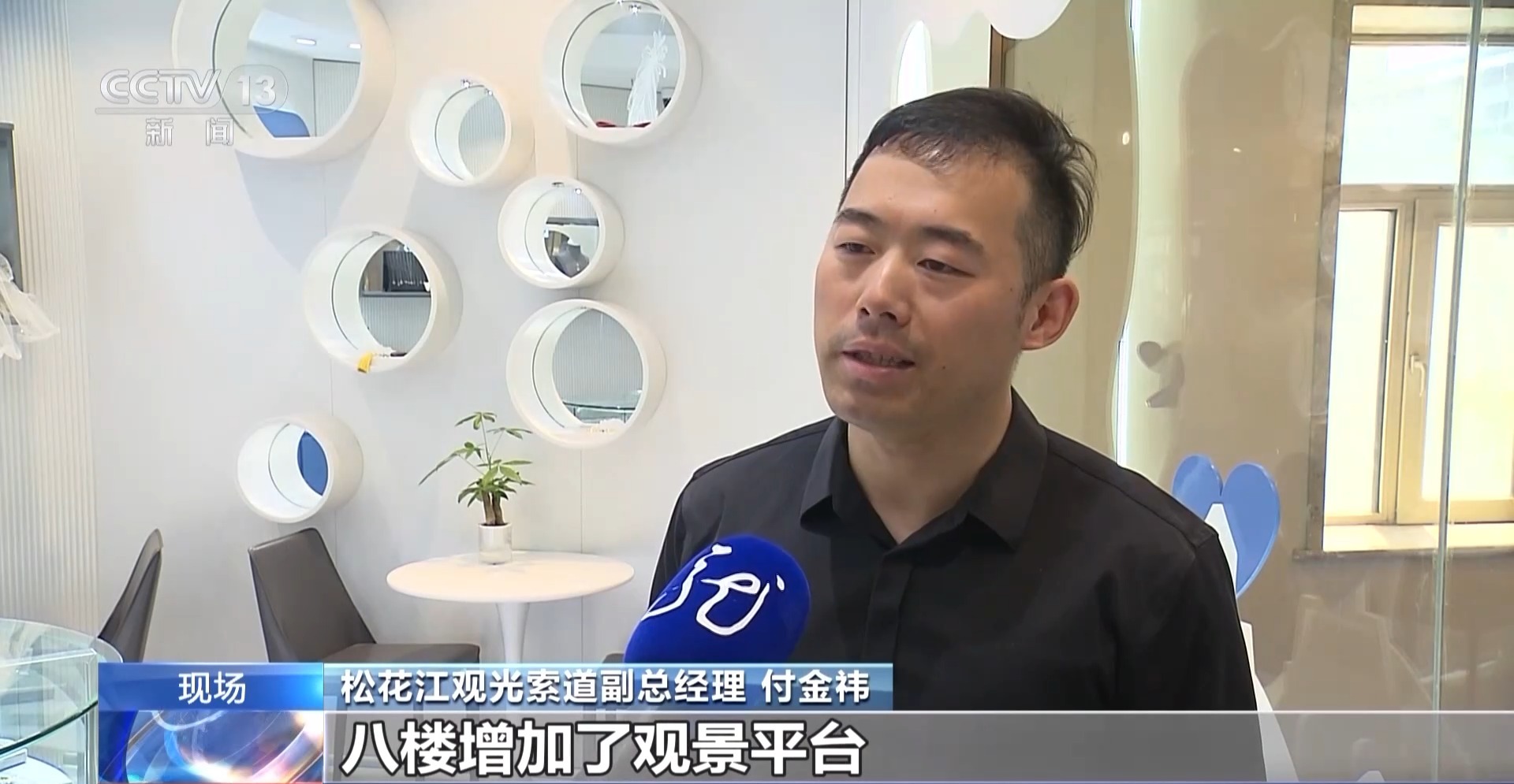 松花江观光索道副总经理 付金祎:我们也将新推出音乐阳台,将营业时间延长到晚上十点钟,八楼增加了观景平台,可以让游客看到整个松花江江景。