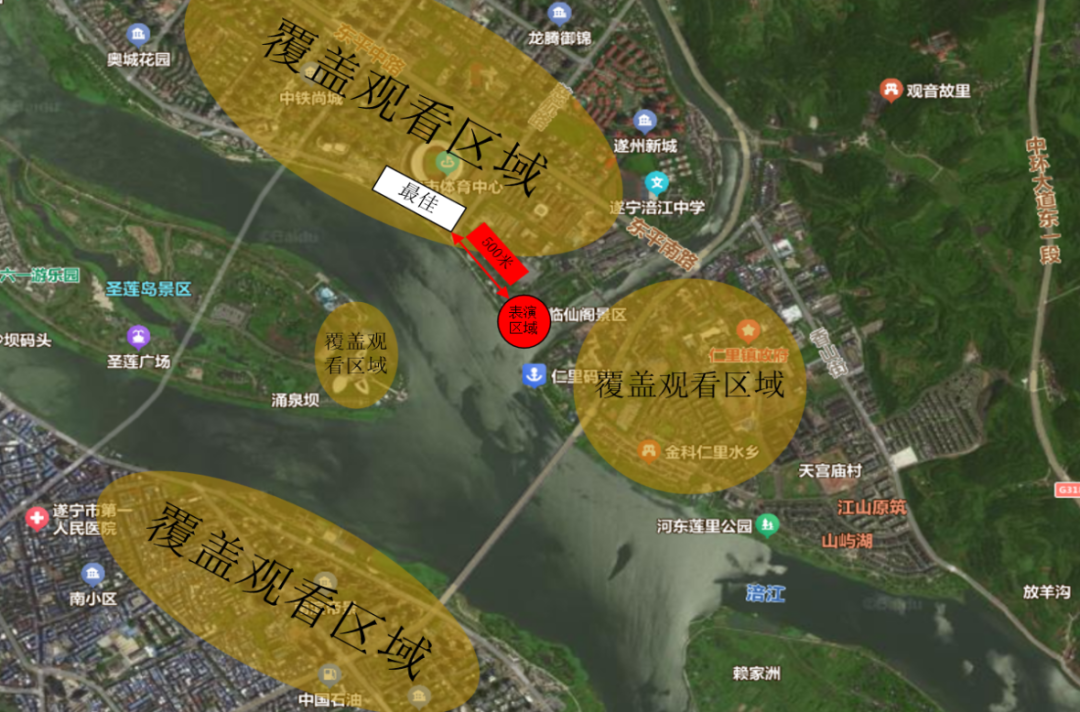 10月1日至2日,光影秀首站落地临仙阁景区,演出时间分别为10月1日22:00-22:15、10月2日20:00-20:15。活动以“星河为笔,仙阁为卷”打造文化艺术主题,夜空中不仅将呈现遂宁特色文化符号,更会闪现“川超”相关光影造型,让刚为赛事呐喊的球迷延续热血激情。市民可前往五彩缤纷路(遂宁市体育中心前方涪江景观绿道)近距离观赏,500米范围内为最佳视角;遂宁首座万豪酒店周边、老城区及新城区1.5公里半径内,均能清晰捕捉这场“空中文化展”。